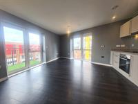 OPEN-PLAN LIVING/ KITCHEN - Spacious and modern with a door leading onto the balcony. Contemporary kitchen with wall and base units housing an integrated fridge/freezer.
