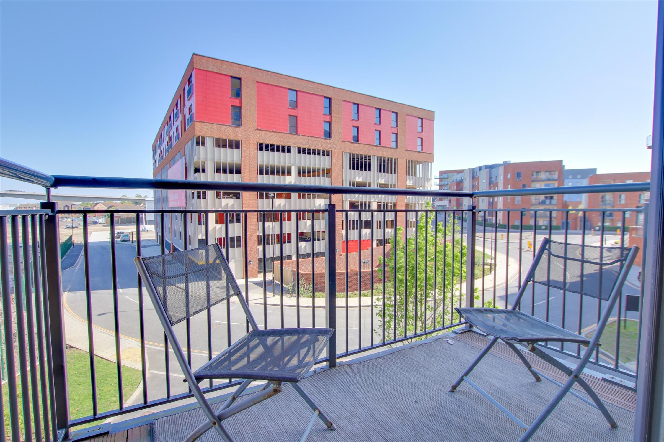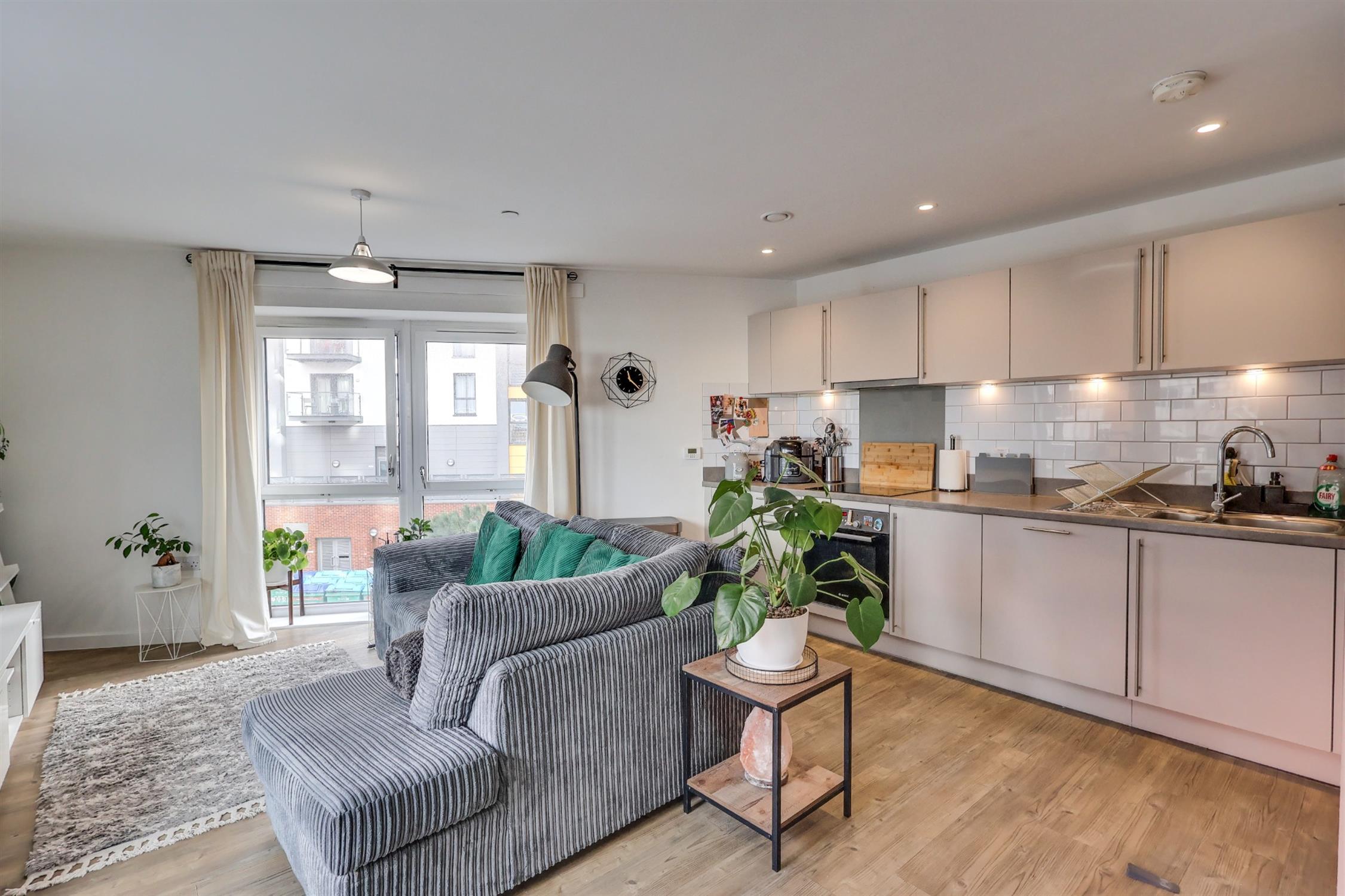Smooth finish to ceiling, double glazed door and window to rear aspect leading onto the balcony, two double glazed windows to side aspect, radiator, luxury laminated flooring, kitchen area: smooth finish to ceiling with inset spotlights, a range of modern wall and base drawer units with work surface over, integrated dishwasher, integrated oven and hob with extractor over, inset sink with drainer unit and built in fridge and freezer.