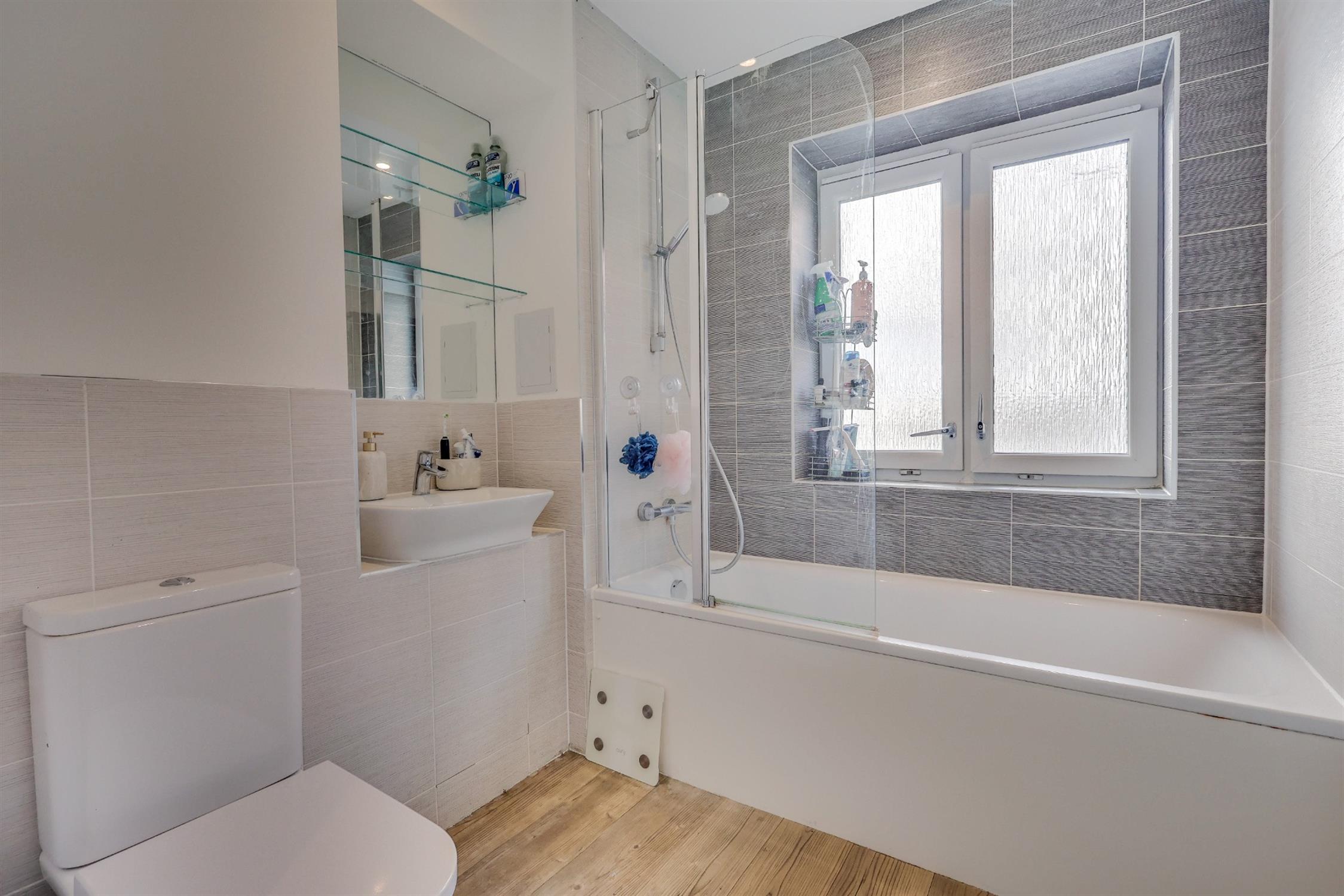 Smooth finish to ceiling, obscured double glazed window to rear aspect, three piece suite comprising of low level w/c, sink, panel enclosed bath with shower over, tiling in principle areas, wood effect flooring.