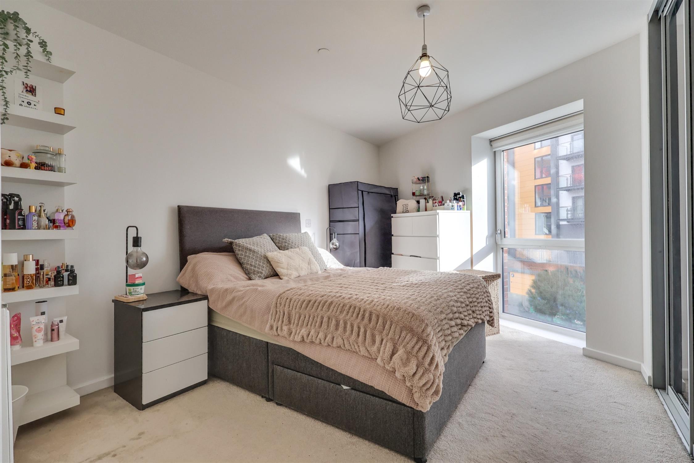 Smooth finish to ceiling, double glazed window to the side aspect and carpeted floor, built in wardrobe with hanging rail and shelving, radiator.
