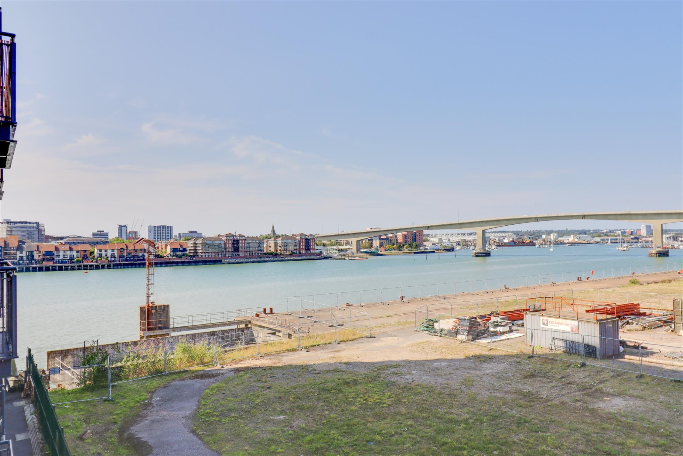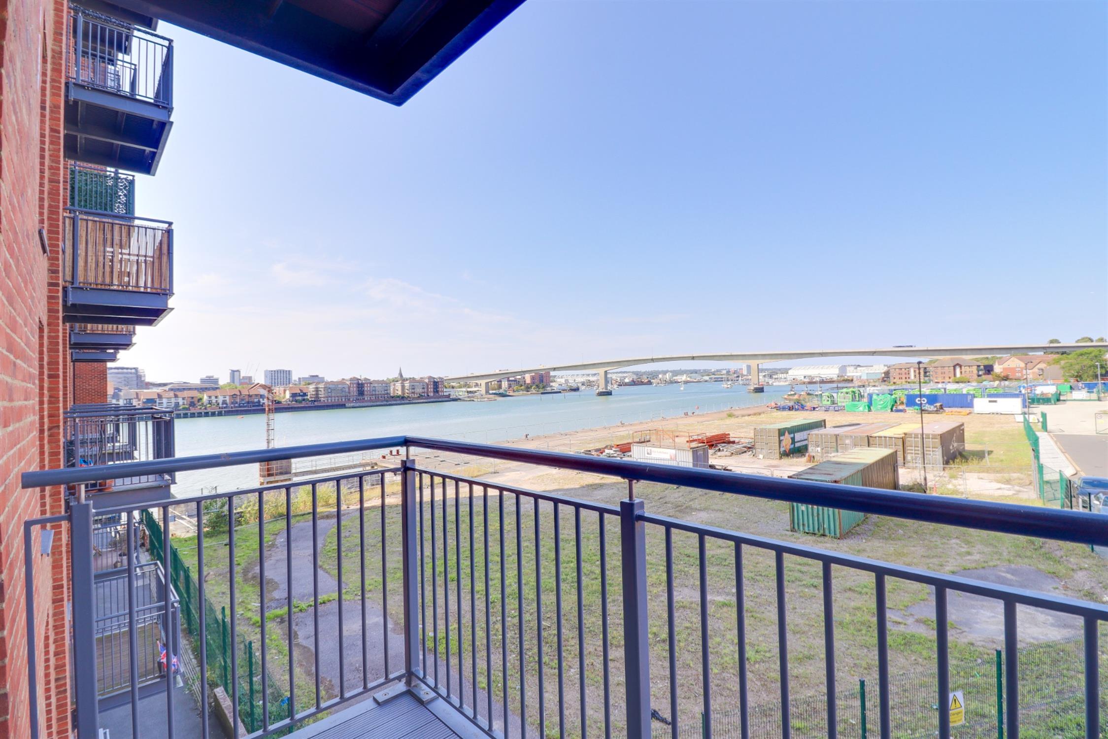 Rail enclosed balcony with views of the water and Itchen bridge.