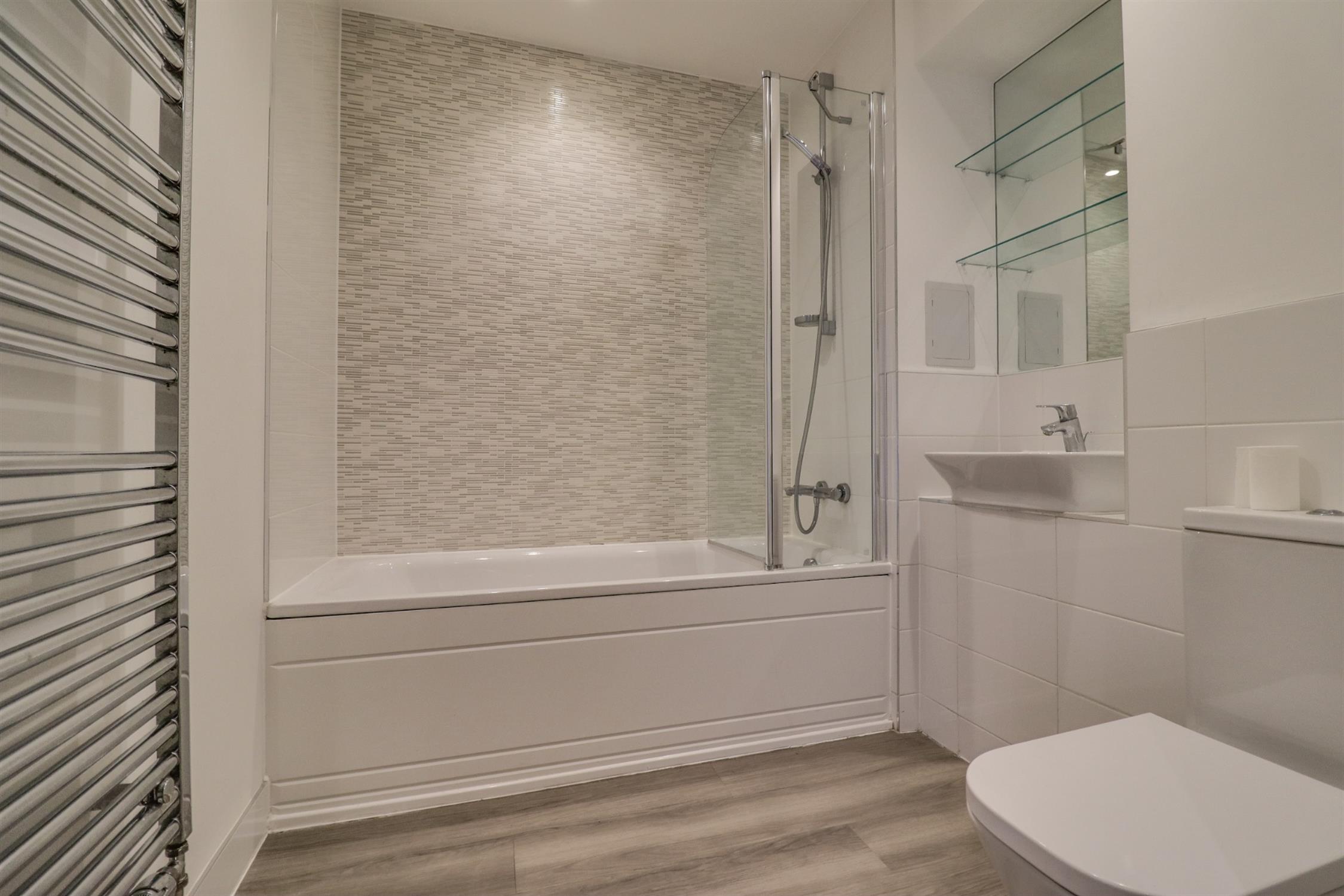 Smooth finish to ceiling with inset spotlights, modern three piece suite comprising of WC, hand wash basin, panel enclosed bath with shower screen and shower over, tiling to applicable areas, heated ladder towel rail.
