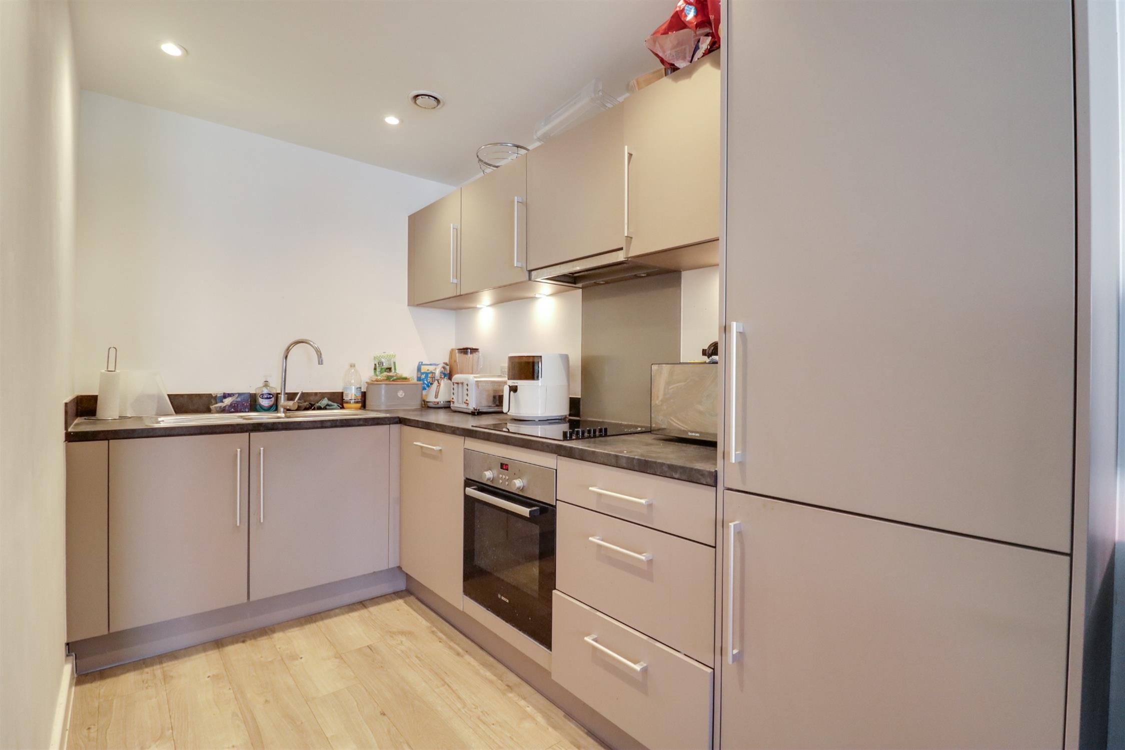 Lounge: Smooth finish to ceiling, uPVC double glazed window to front aspect and uPVC double glazed door and window to side aspect opening onto balcony, kitchen: a range of modern wall and base drawer units with work surface over, built in oven and electric hob over, stainless steel sink and drainer inset, integrated dishwasher and fridge freezer, wood effect flooring, radiator.