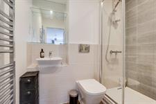 Smooth finish to ceiling, spotlights, tiled floor to ceiling, panel enclosed bath with shower over, low level WC, hand wash basin, heated ladder towel rail.