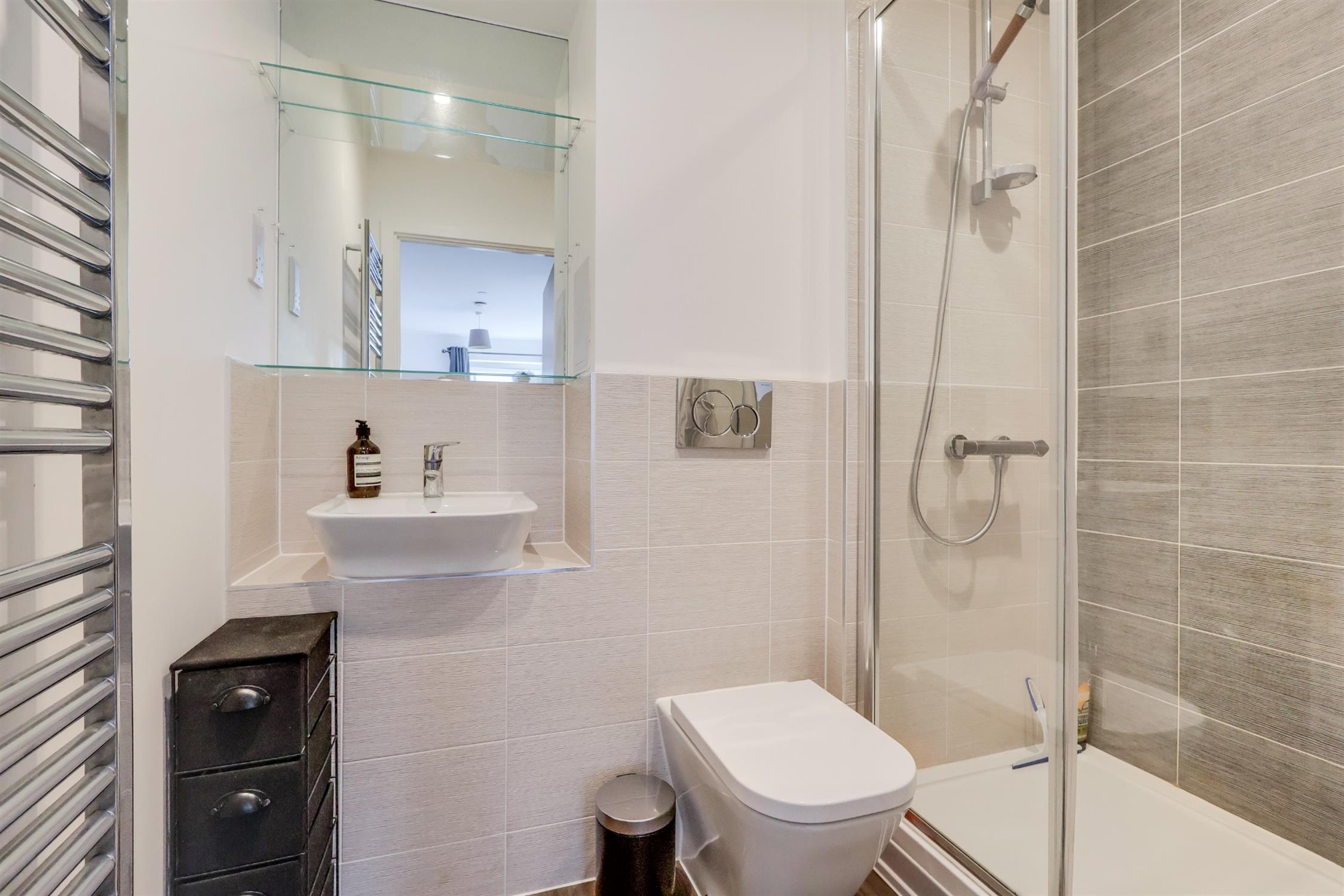 Smooth finish to ceiling, spotlights, shower cubicle with sliding door, wash hand basin, WC, extractor, heated towel rail, tiled floor to ceiling.