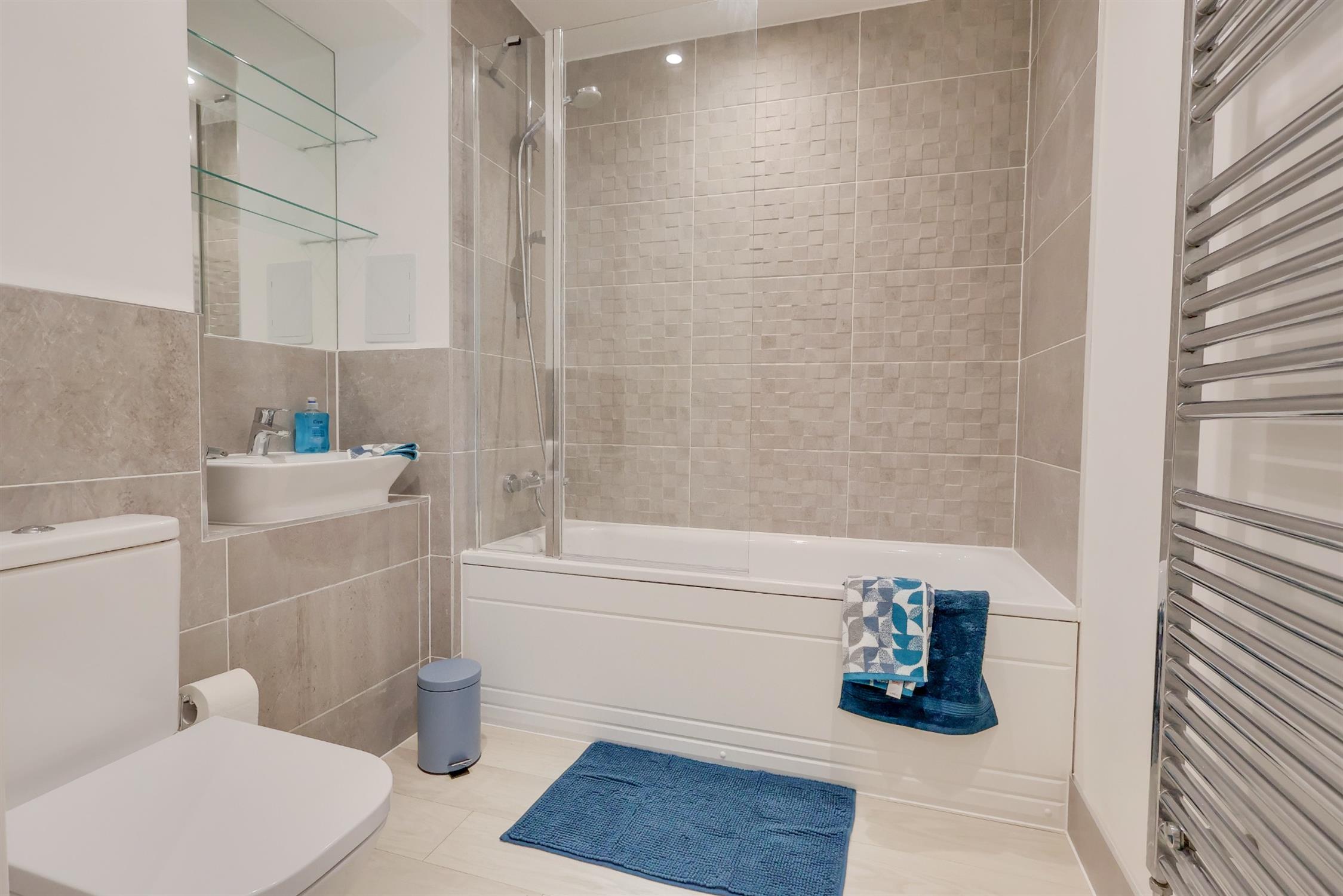 Smooth finish to ceiling, modern three piece suite comprising of WC, hand wash basin, panel enclosed bath with shower screen and shower over, tiling to principle areas, heated towel rail.