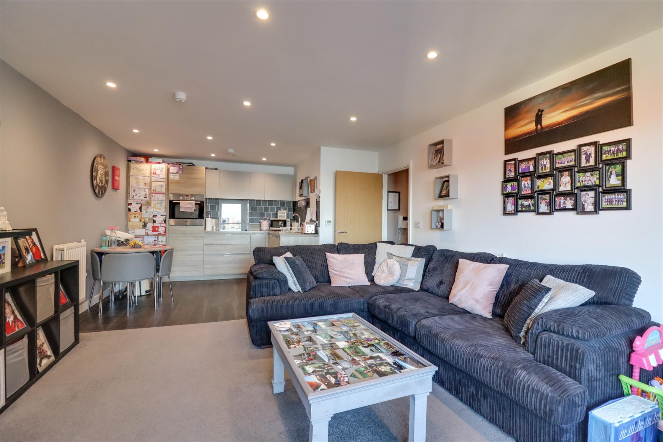 Smooth ceiling with spotlights, double glazed window and door to rear aspect leading on to balcony, radiator, opening to: Kitchen: Smooth ceiling with spotlights, range of wall, base and drawer units with work surface over, stainless steel bowl and a half sink and drainer inset, integral fridge/freezer and dishwasher, built in oven and hob, tiled splash backs.