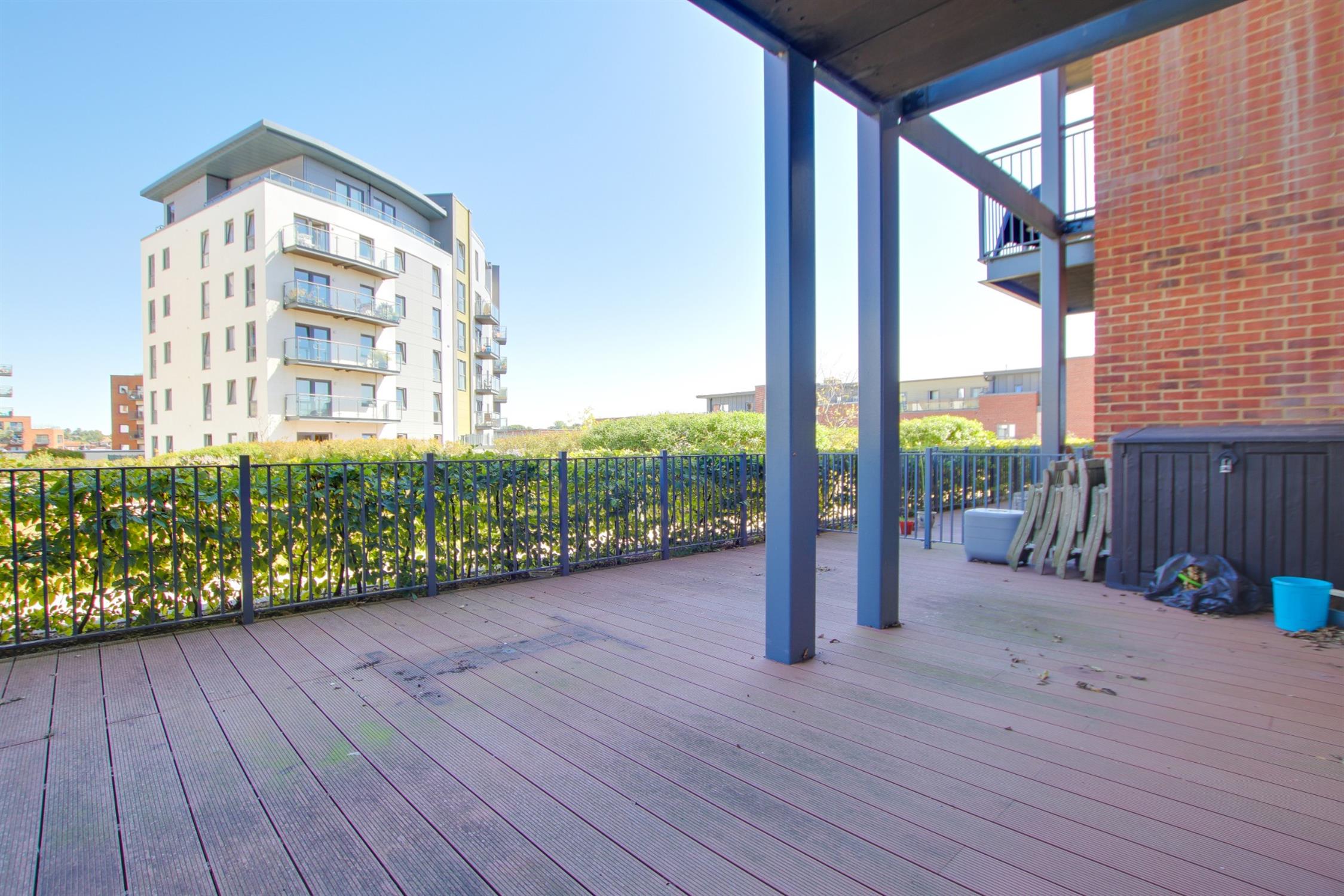Balustrade surround, decked floor, large space for outside dinning, views onto the communal garden.