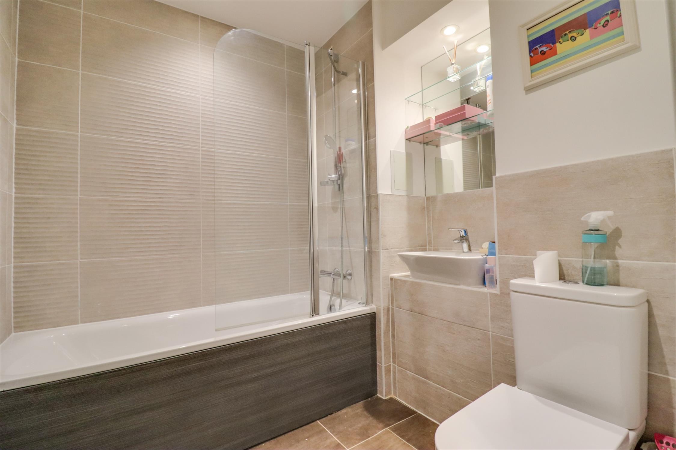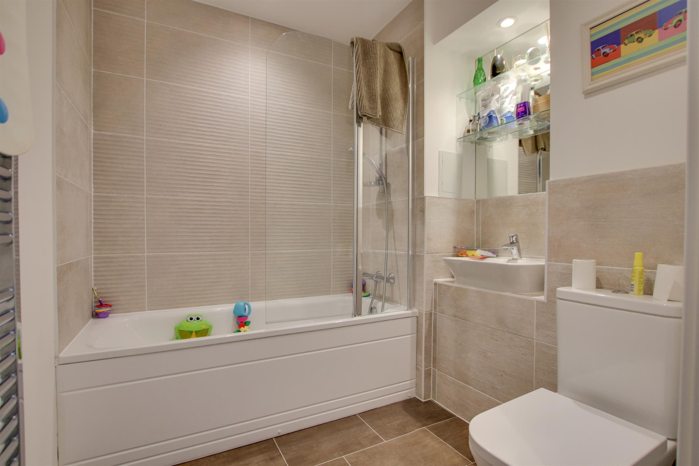 Smooth finish to ceiling, inset spotlights, panel enclosed bath with shower attachment over, hand wash basin and low level WC, heated towel rail, tiling in principle areas, shaving points.