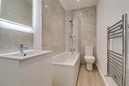 BathroomSmooth finish to ceiling with inset spotlights, panel enclosed bath with shower over, low level WC and wash hand basin, heater ladder towel rail, tiling to applicable areas.