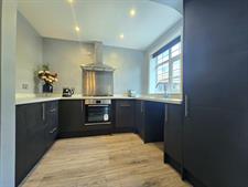 KITCHEN - A modern fitted kitchen with a range of base units, oven and gas hob, and integrated dishwasher. French doors provide access to the rear garden