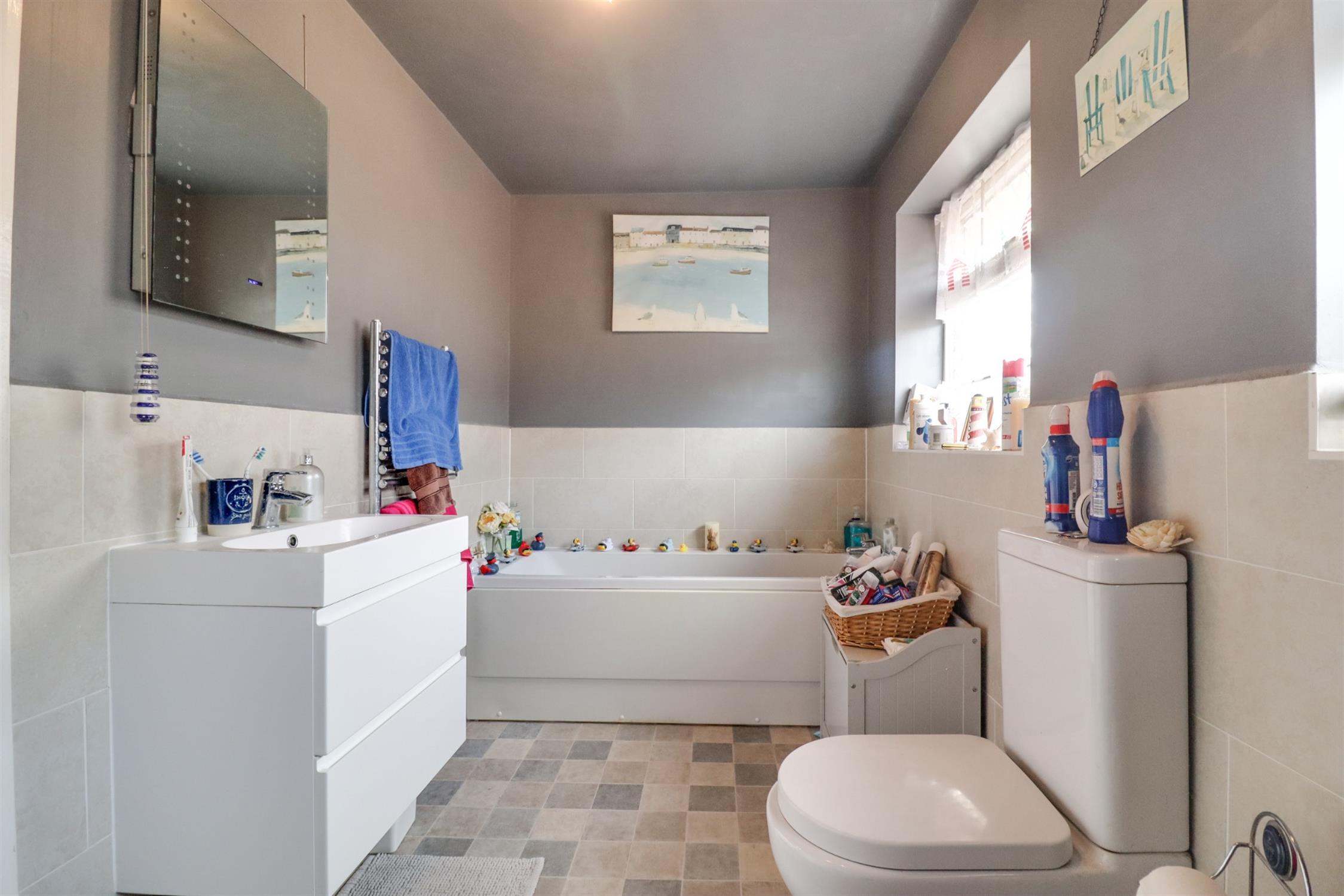 Smooth finish to ceiling, obscured double glazed windows to side elevation, four piece suite comprising panel enclosed bath, walk in shower cubicle with mains fed shower, vanity wash hand basin and low level WC, heated ladder towel rails, tiling to applicable areas.