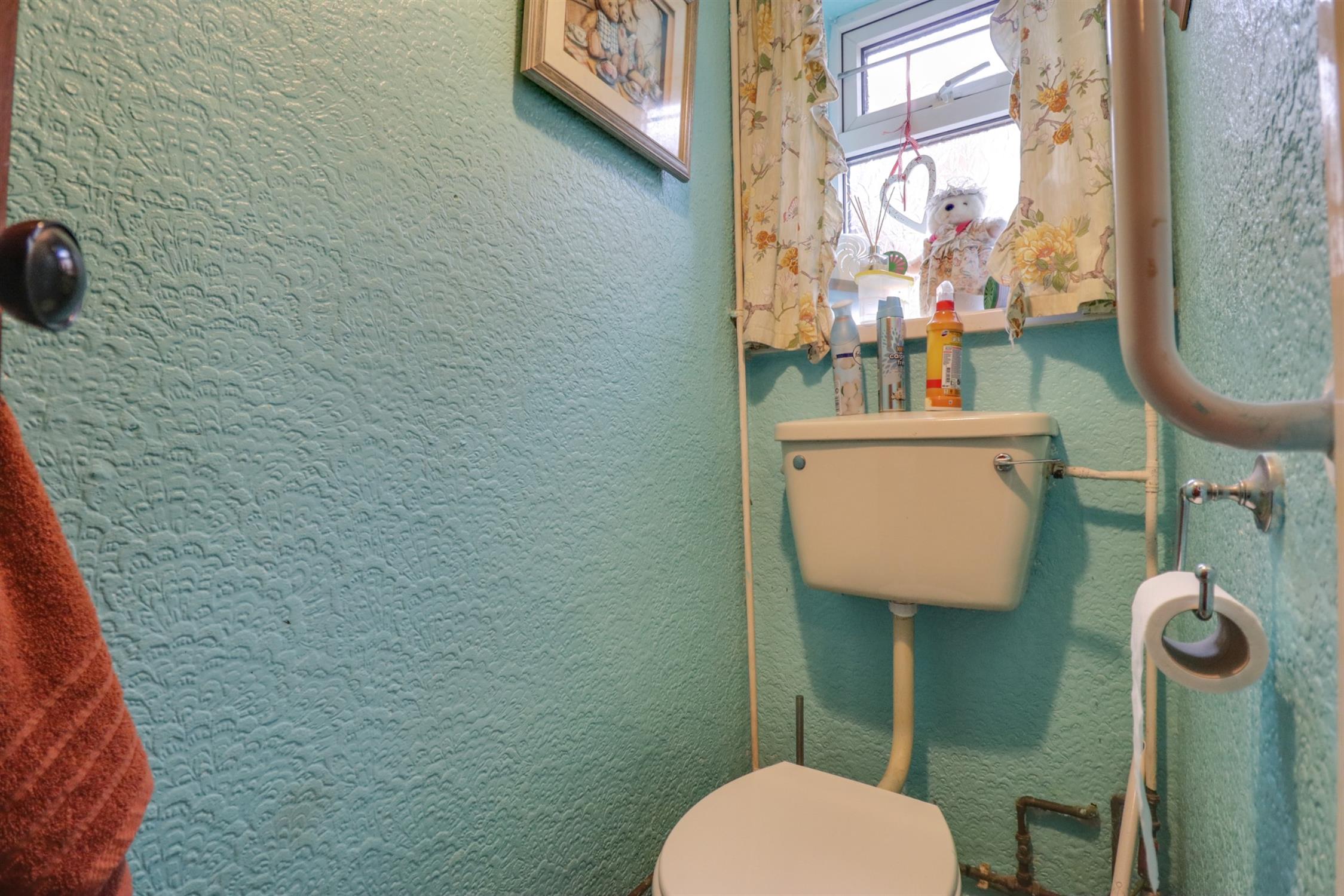 Textured finish to ceiling, obscured double glazed window to side elevation, low level WC and wash hand basin.