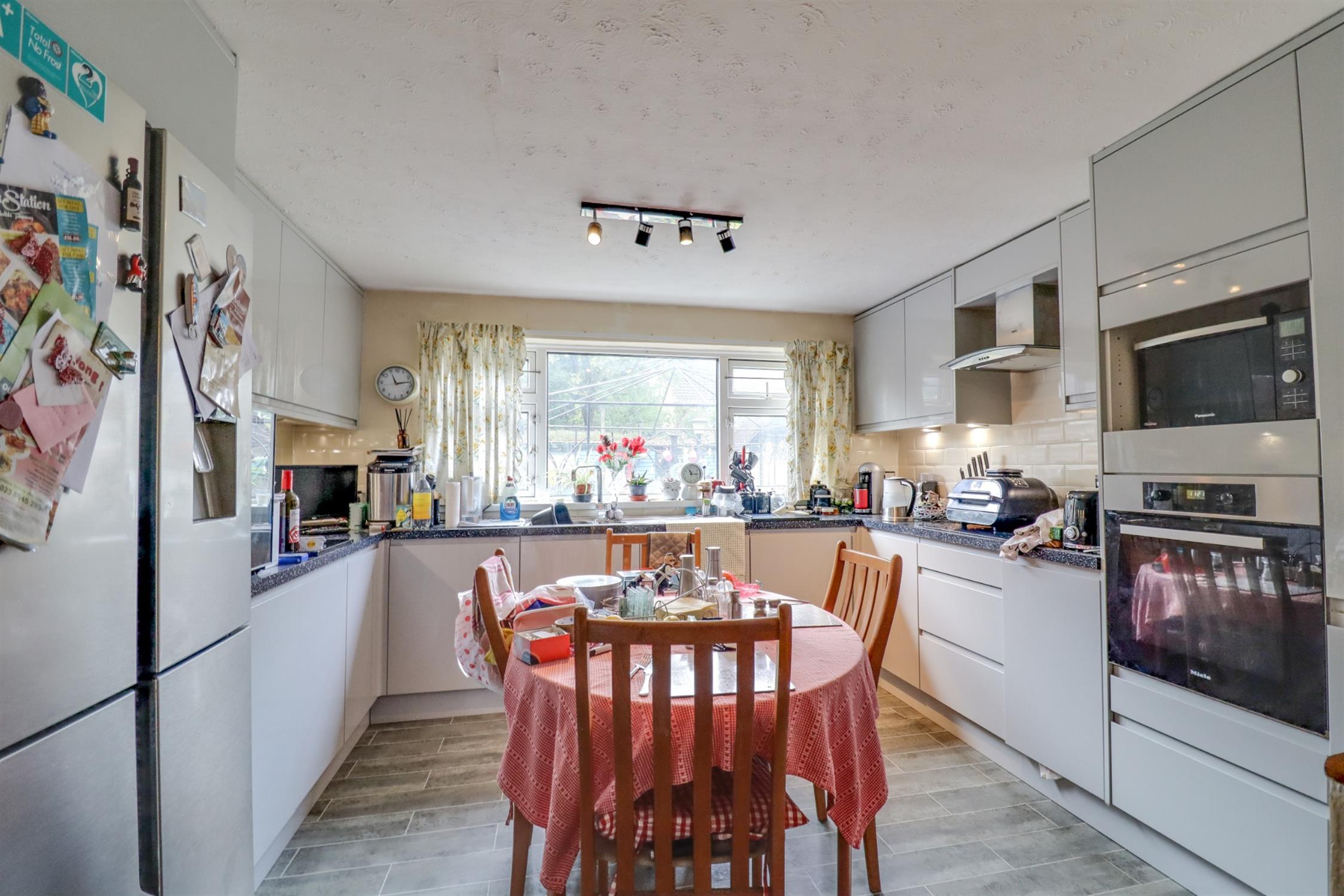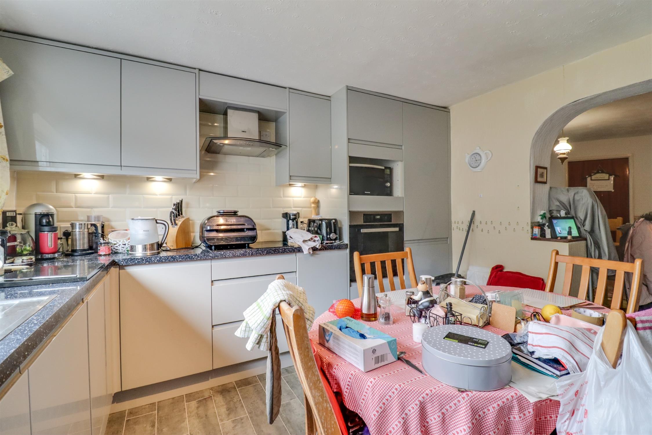 Textured finish to ceiling, double glazed window to side elevation, double glazed door to side elevation, storage cupboard housing meters, radiator, archway into: Kitchen: Textured finish to ceiling, double glazed window to rear elevation, modern wall, base and drawer units with work surface over, stainless steel sink and drainer inset, integrated oven with hob and extractor fan over, space for American fridge freezer, tiled splash backs.