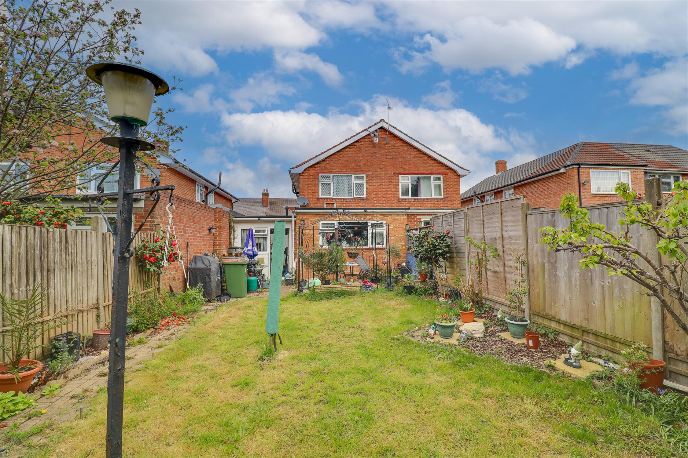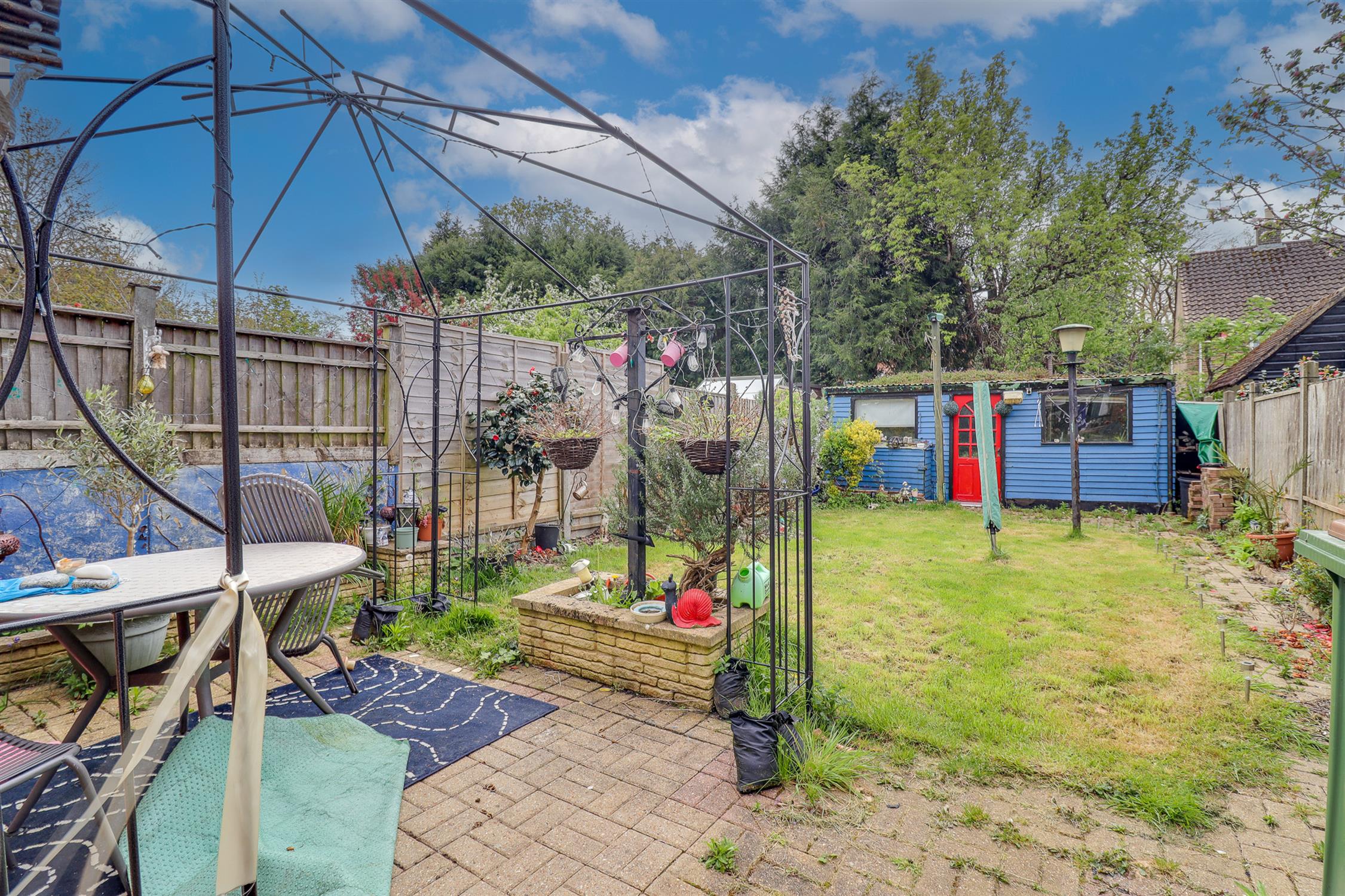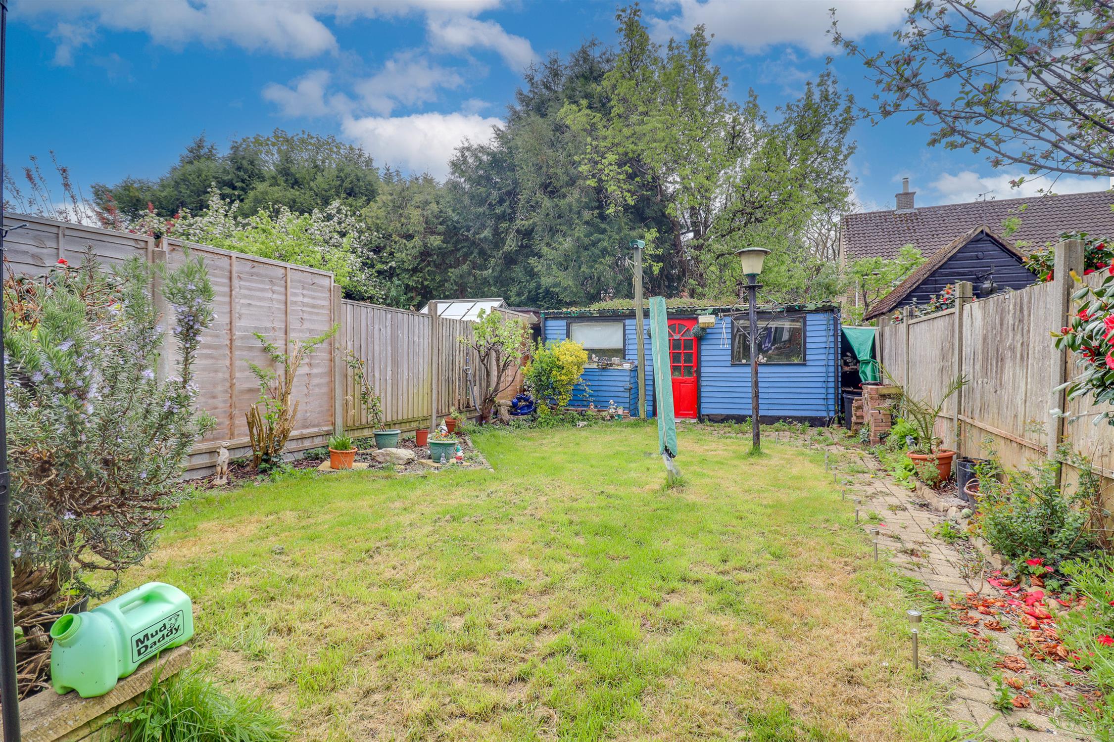 Fence enclosed rear garden, mainly laid to lawn with patio seating area, pathway leading to shed with power and light connected and log burner, flower and shrub borders.
