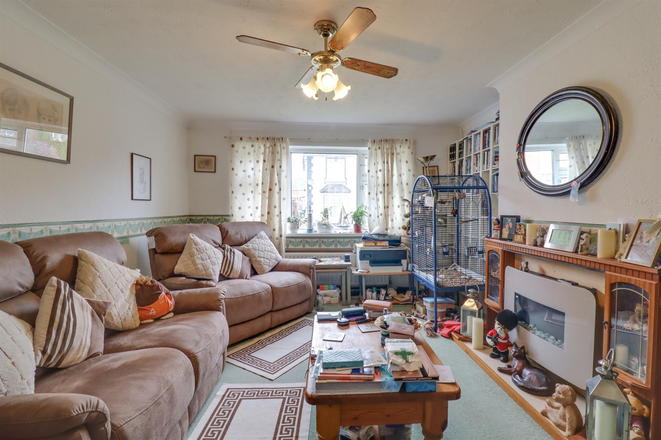 Textured finish to coved ceiling, double glazed window to front elevation, electric fireplace, radiator.