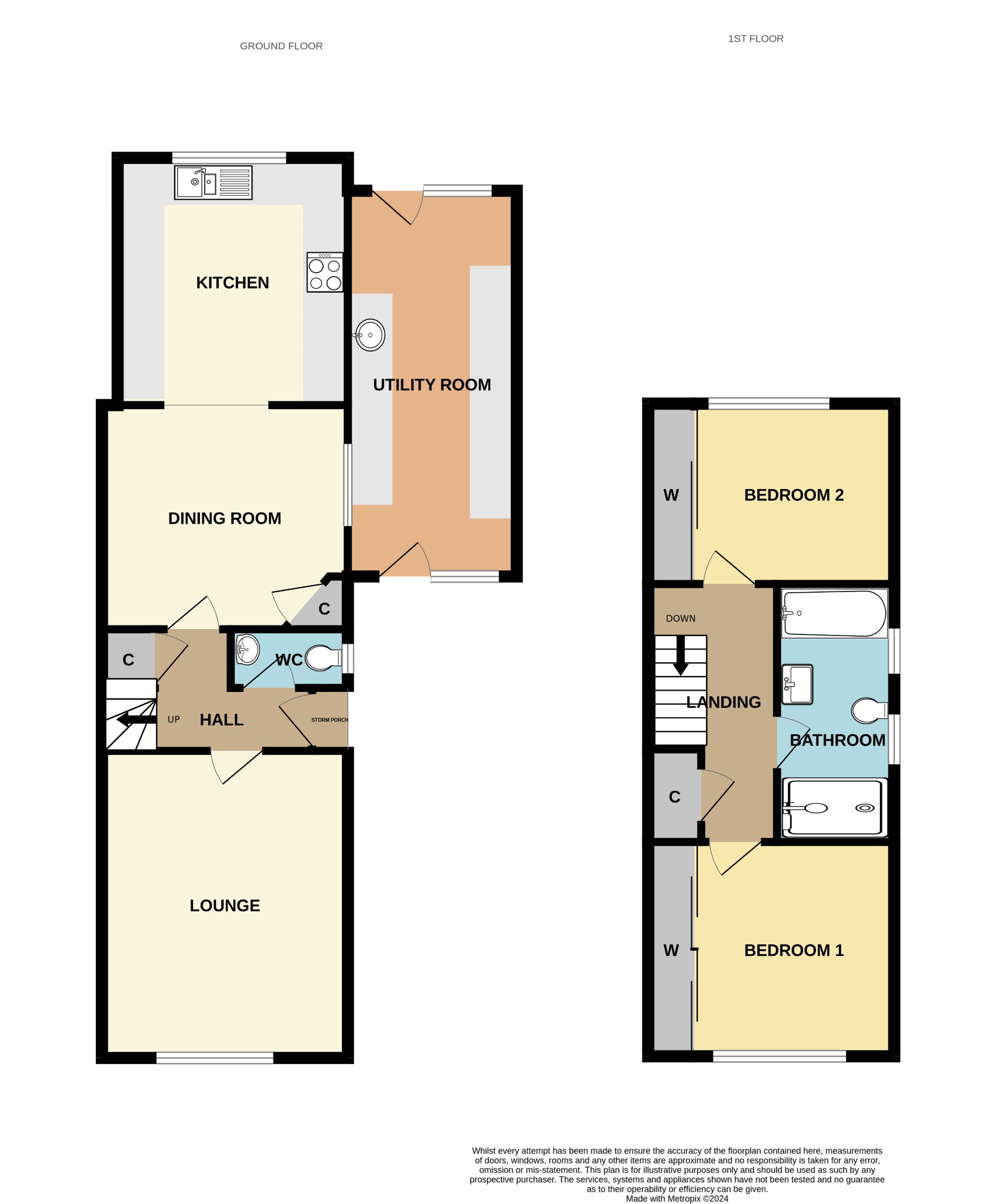 Textured finish to ceiling, obscured double glazed door and window to front elevation, double glazed door and window to rear elevation into rear garden, range of wall and base units with work surface over, stainless steel sink inset, space for fridge freezer and tumble dryer, plumbing for washing machine, wall mounted combination boiler.