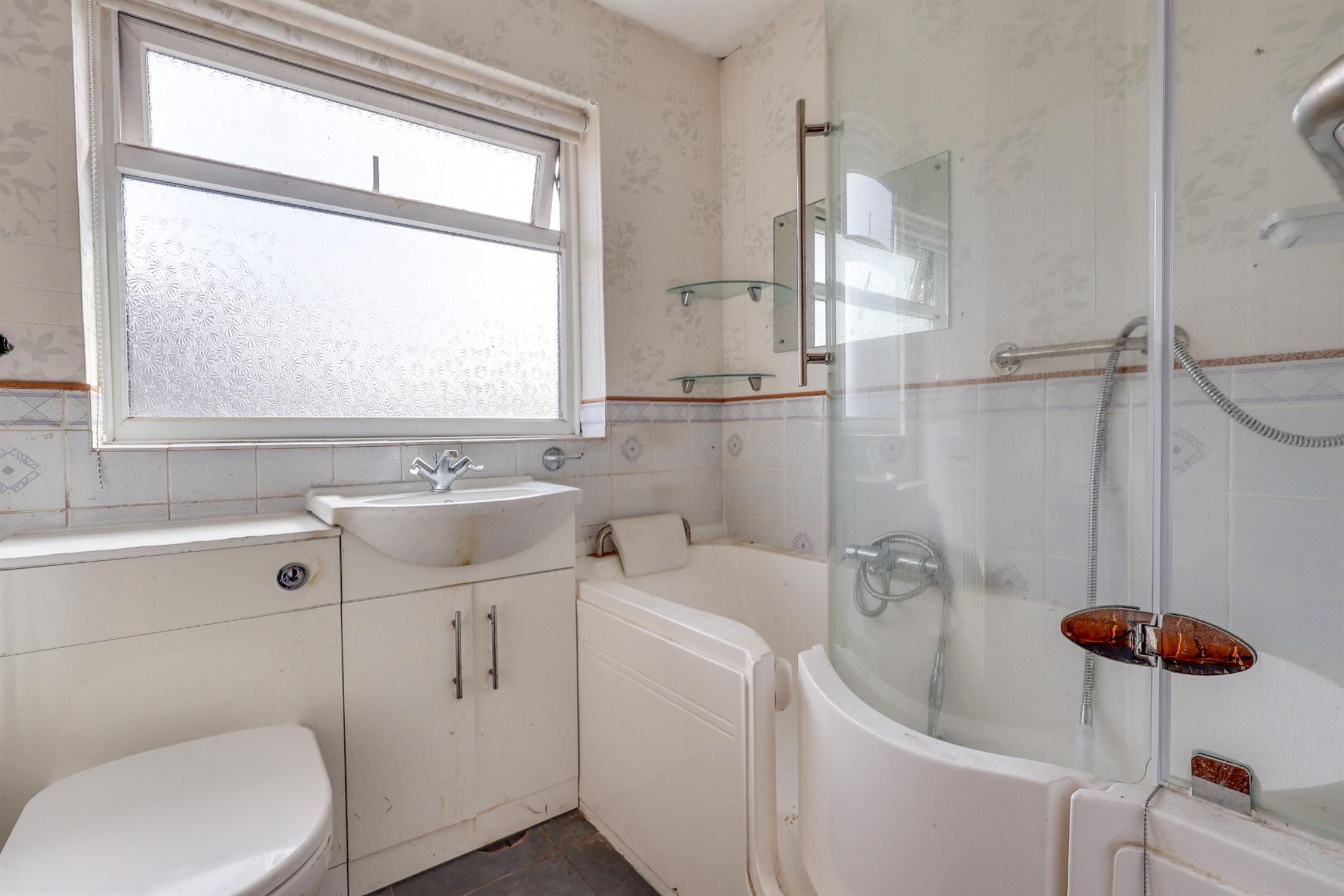 Textured finish to ceiling, double glazed window to rear elevation, p shape bath with shower over, vanity hand wash basin and wc unit, tiling in applicable areas.
