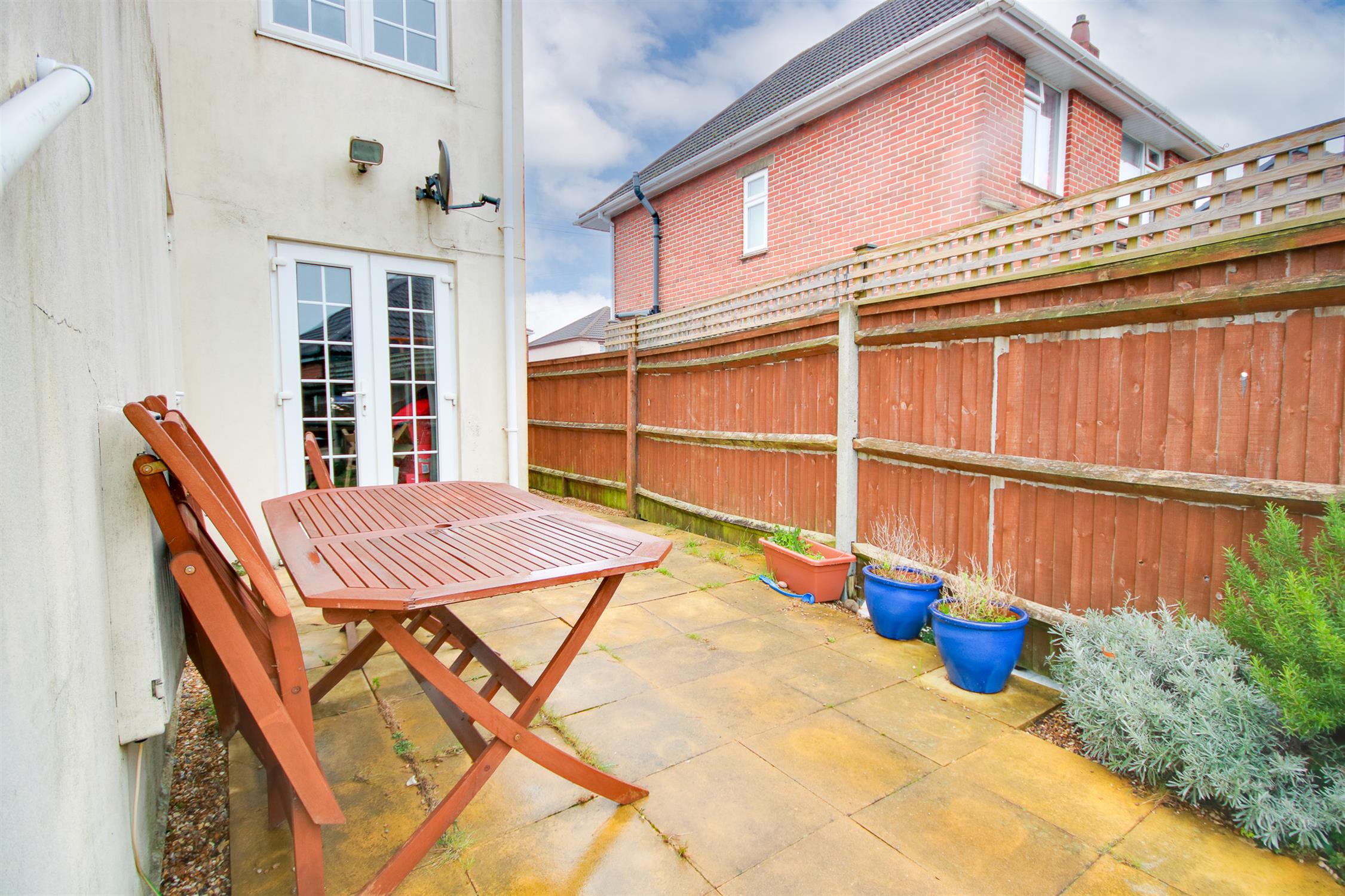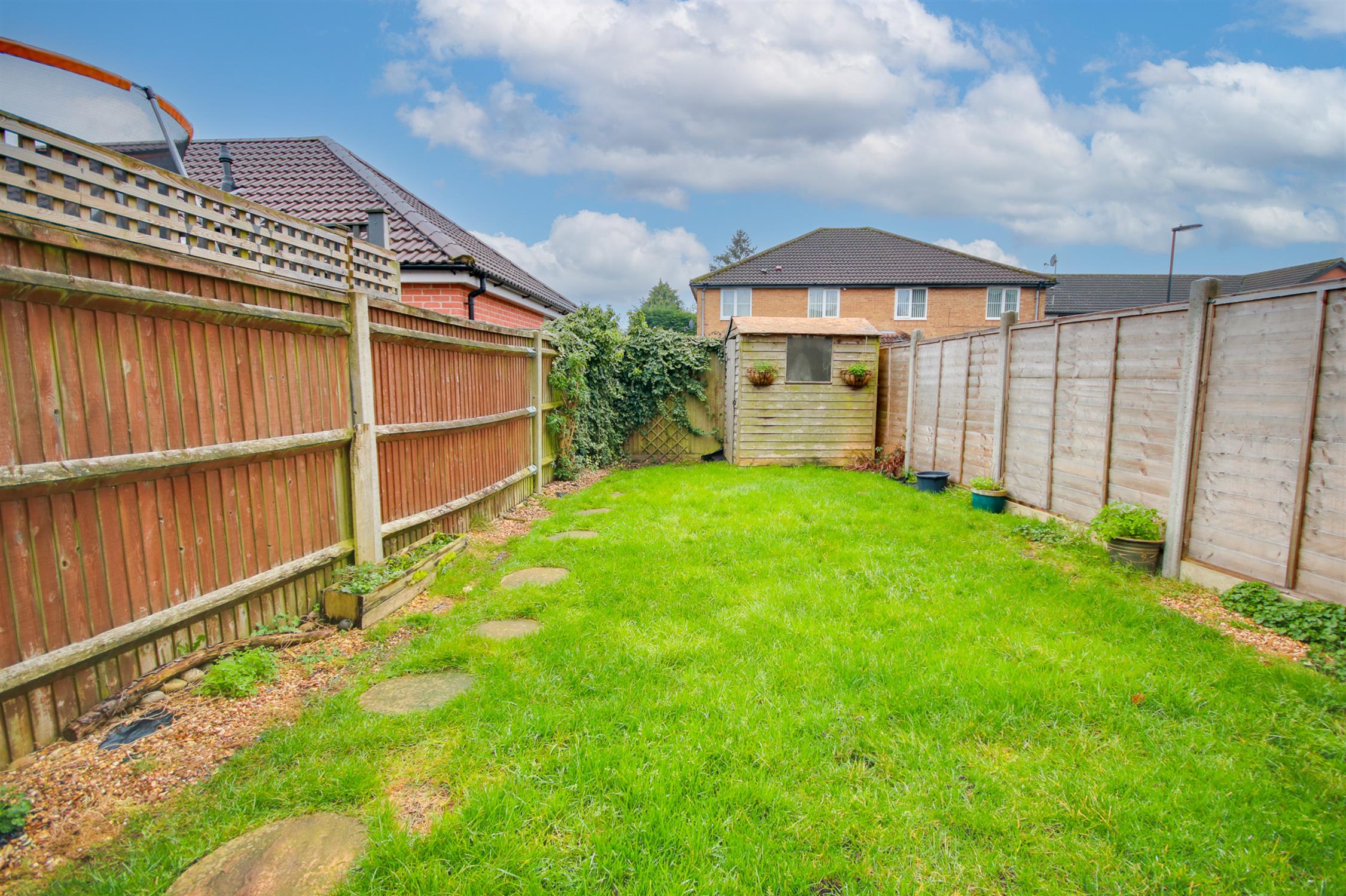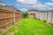 Fence enclosed rear garden, patio seating area leading to lawn, shed.