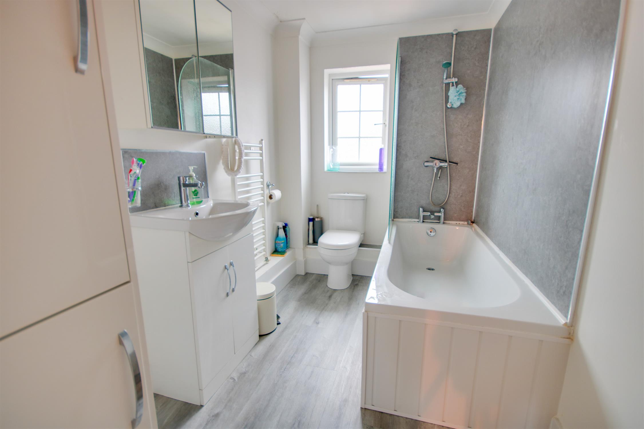 Smooth and coved ceiling with inset spotlights, UPVC double glazed obscured window to front, three piece suite comprising: WC, wash hand basin and panel enclosed bath with shower over, heated ladder towel rail, laminate floor.