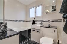 Smooth finish to ceiling, spotlights, double glazed window to rear elevation. Panel enclosed bath with shower over, vanity unit housing sink and toilet, heated towel radiator, tiling from floor to ceiling.