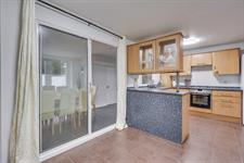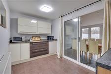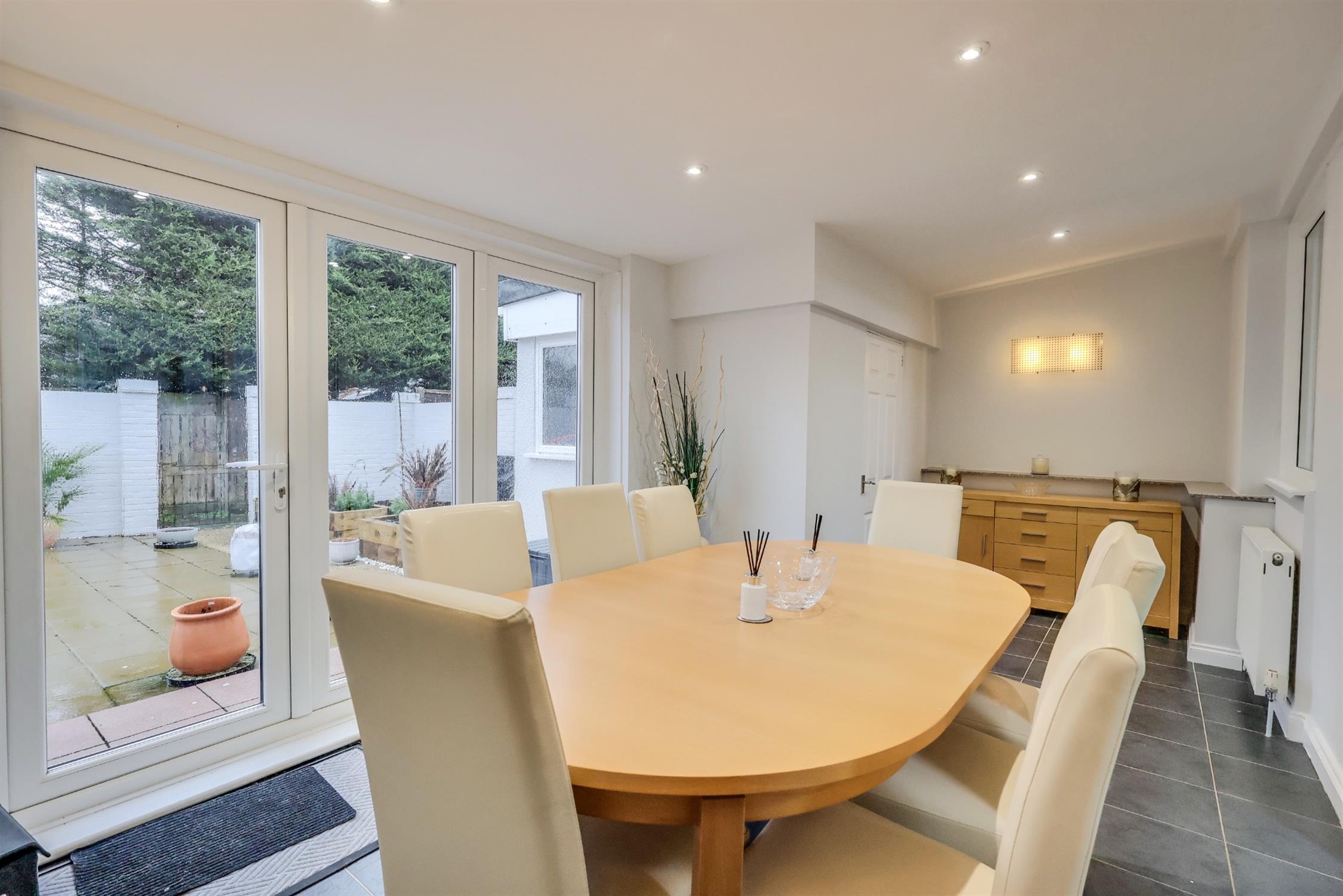Smooth finish to ceiling, double glazed window & sliding doors to rear elevation, a range of wall, base and drawer units with roll top work surface over, inset sink and drainer. Integrated cooker with gas hob and extractor fan over, space for fridge freezer, radiator.