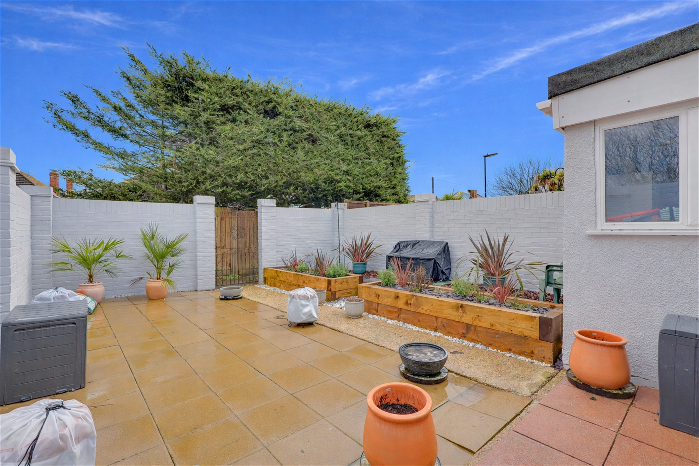 Wall enclosed garden with gated rear access. Generous patio seating area with raised planting beds.