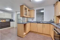 Smooth finish to ceiling, double glazed window & sliding doors to rear elevation, a range of wall, base and drawer units with roll top work surface over, inset sink and drainer. Integrated cooker with gas hob and extractor fan over, space for fridge freezer, radiator.