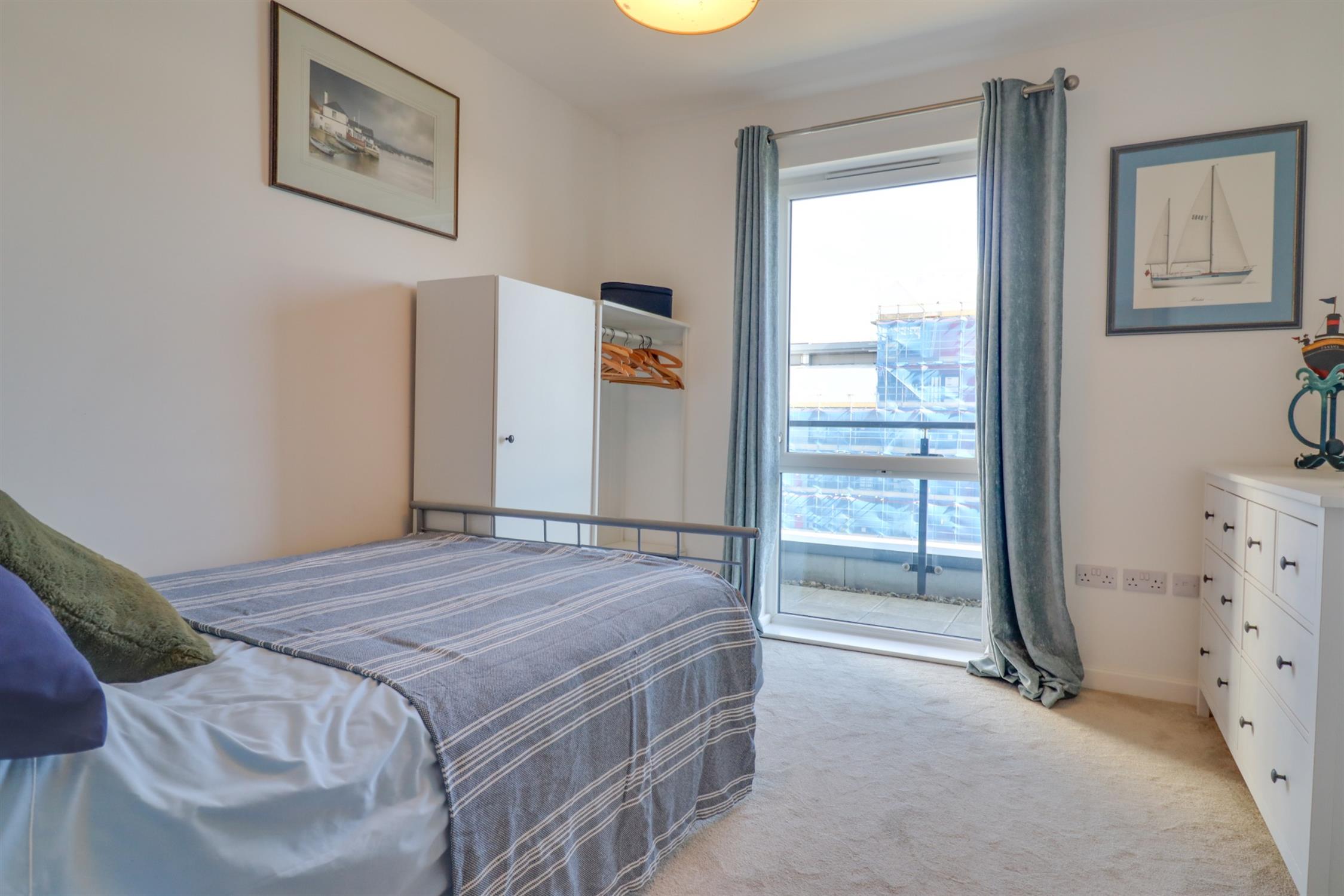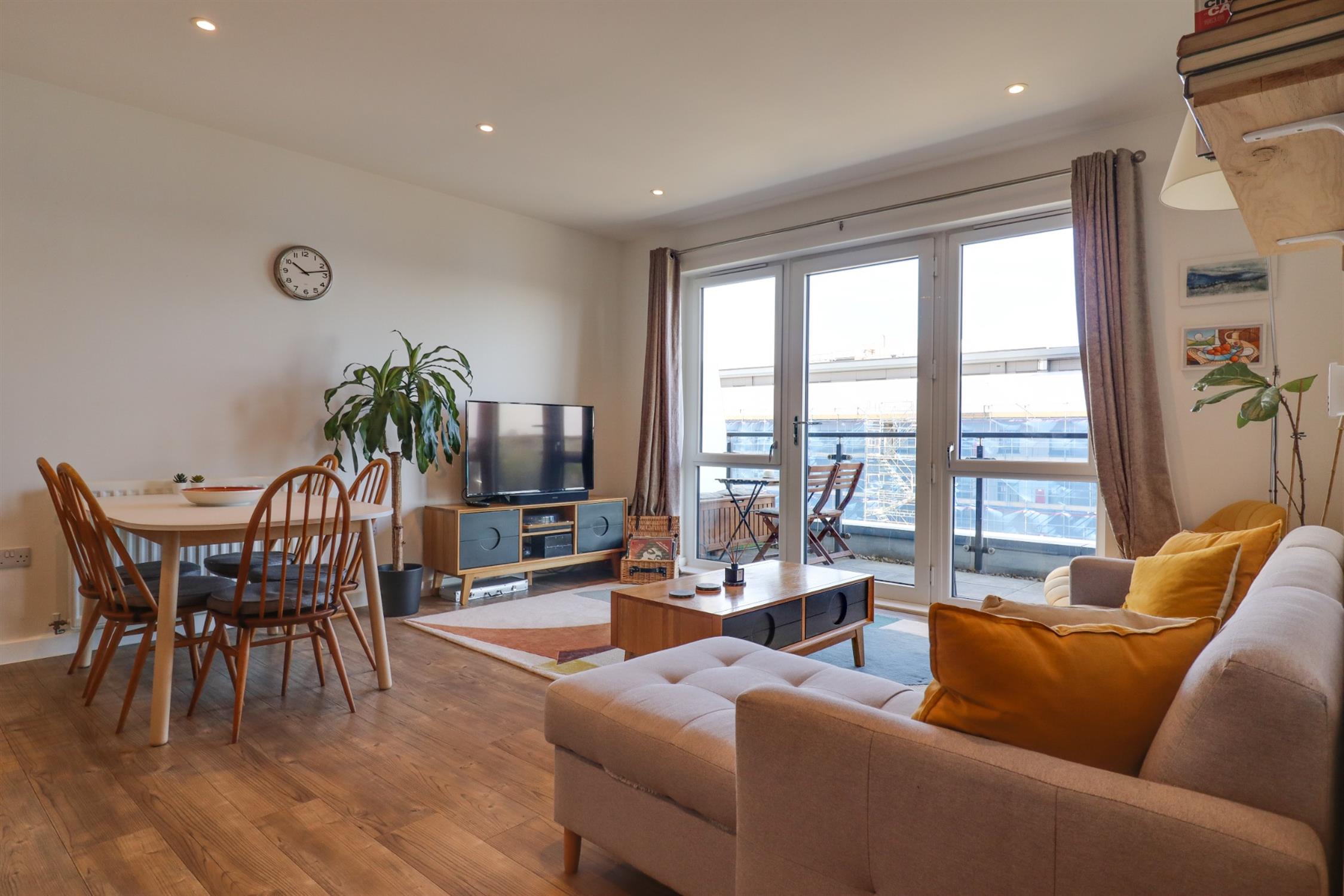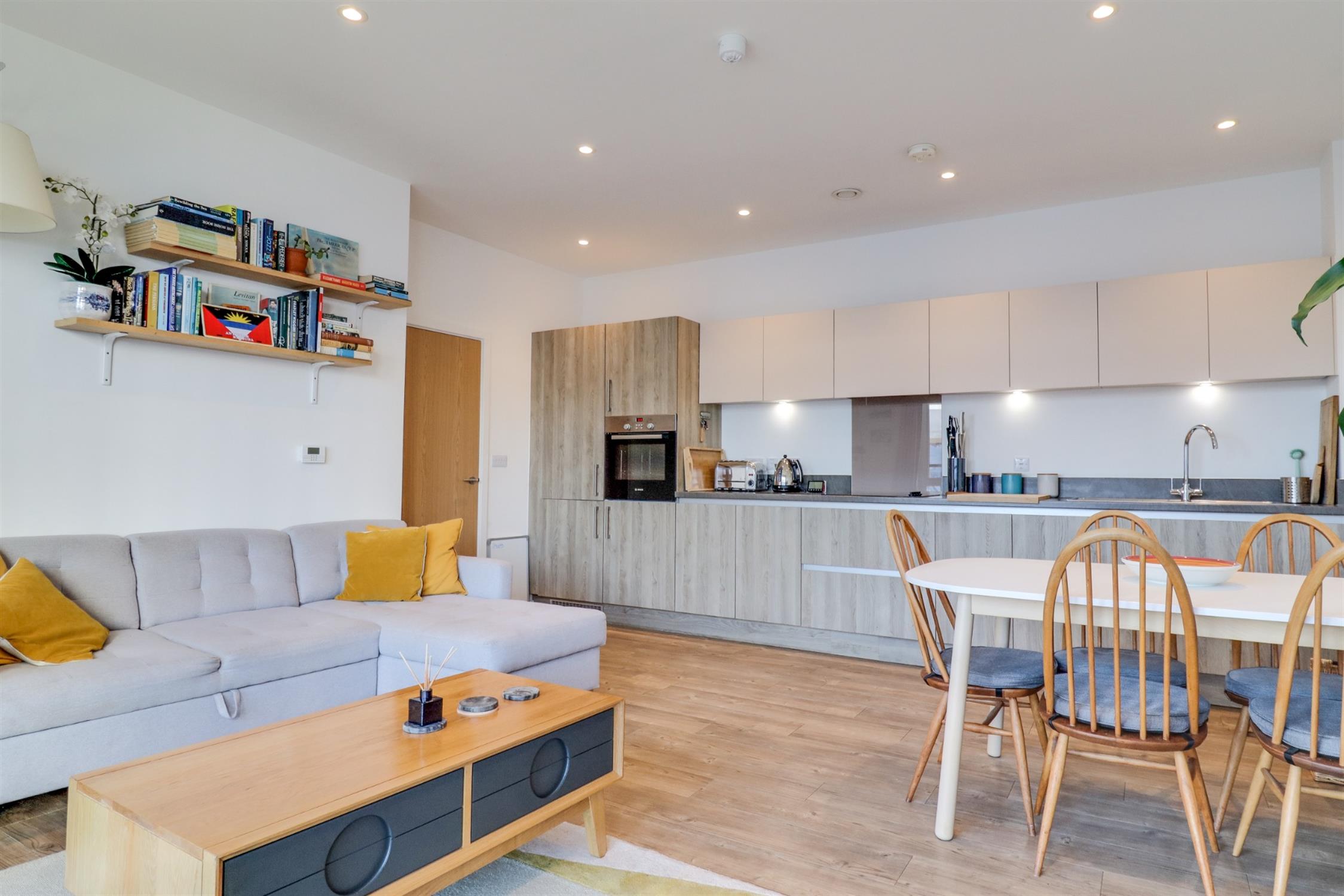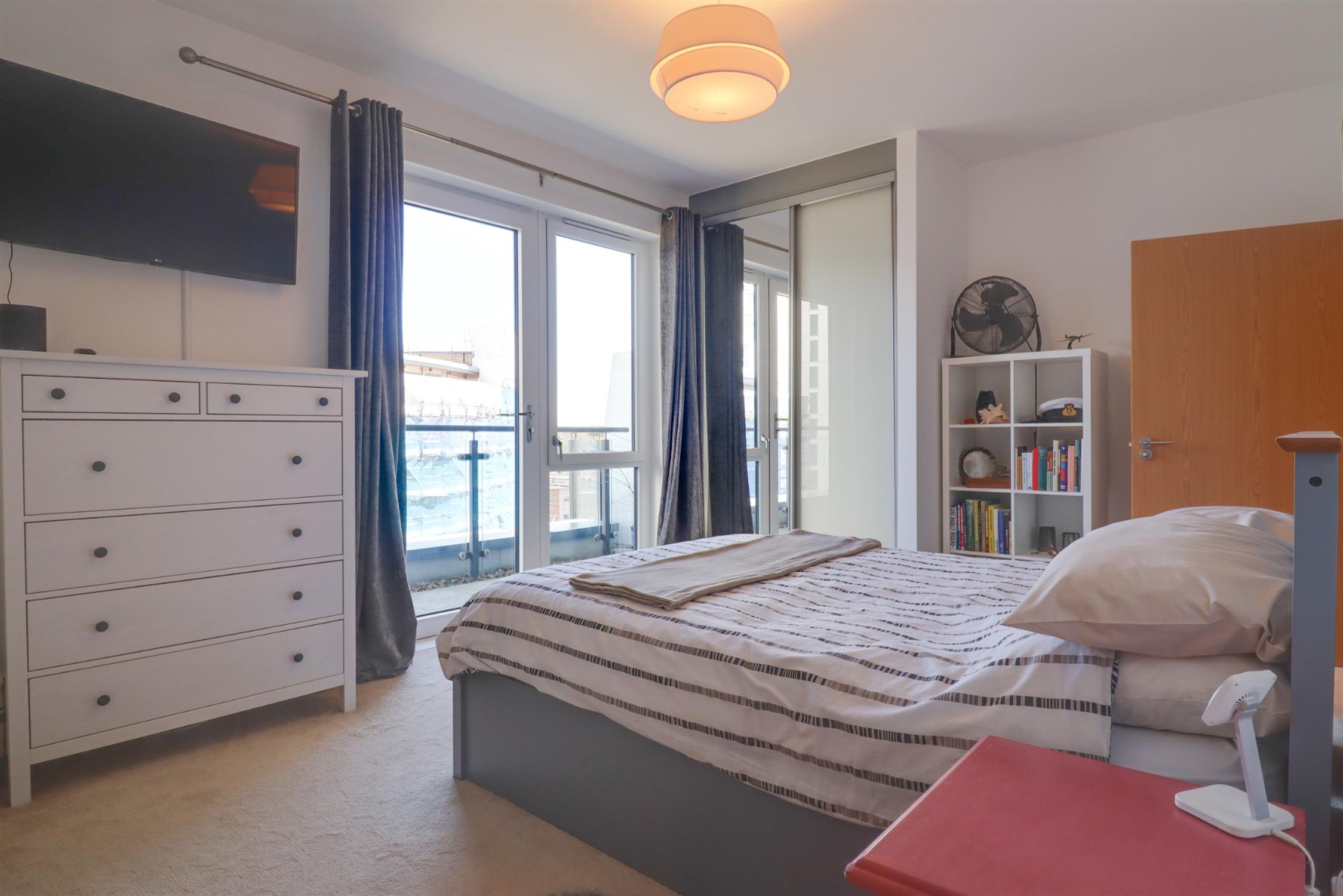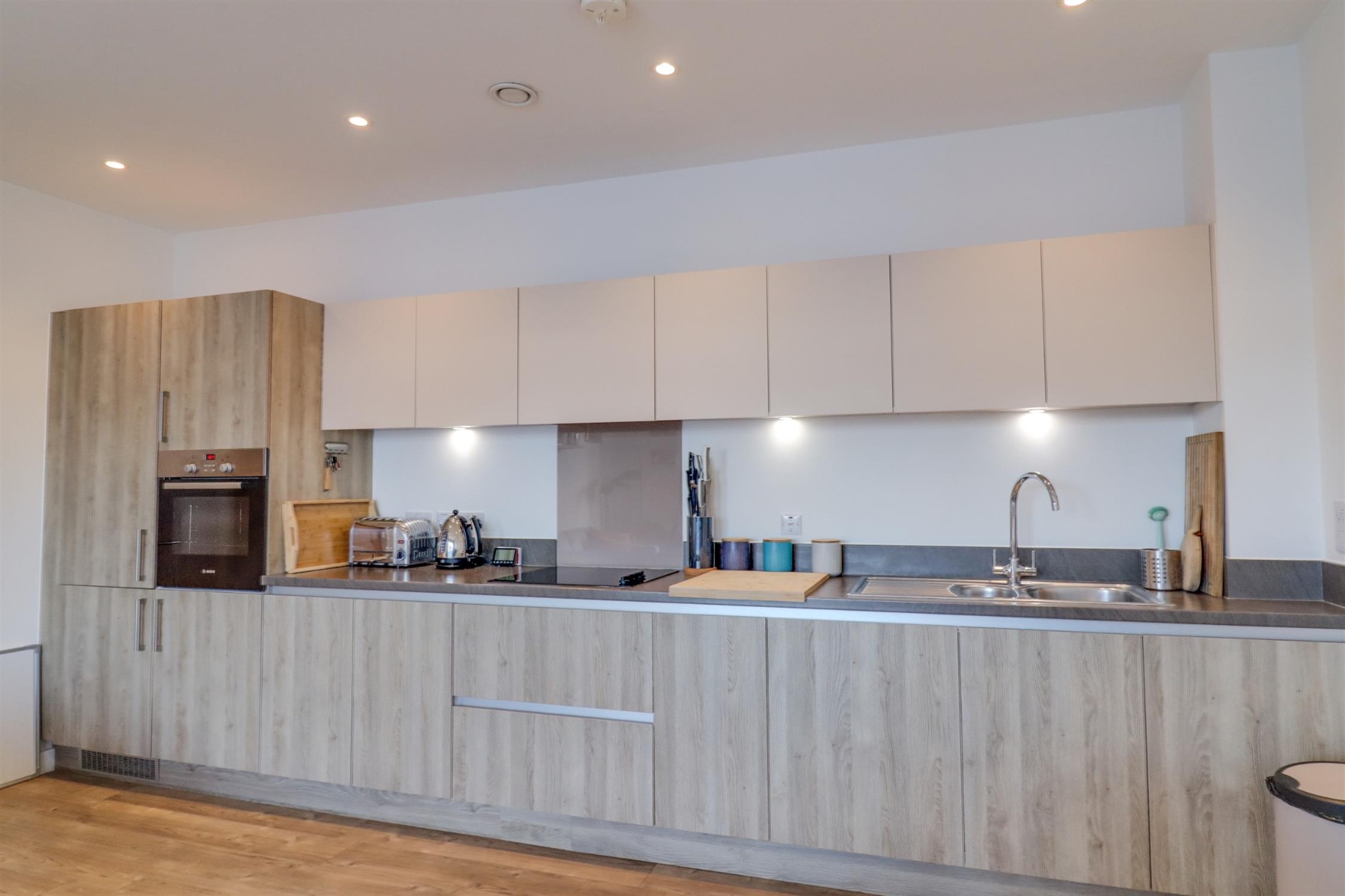 Smooth finish to ceiling with inset spotlights, double glazed windows and door leading onto balcony, radiator, laminated flooring. Kitchen: range of contemporary wall and base units with roll top work surface over, bowl and a half stainless steel sink with drainer inset, A + rated integrated oven & hob with overhead extractor fan, integrated dishwasher and fridge freezer, laminated flooring.