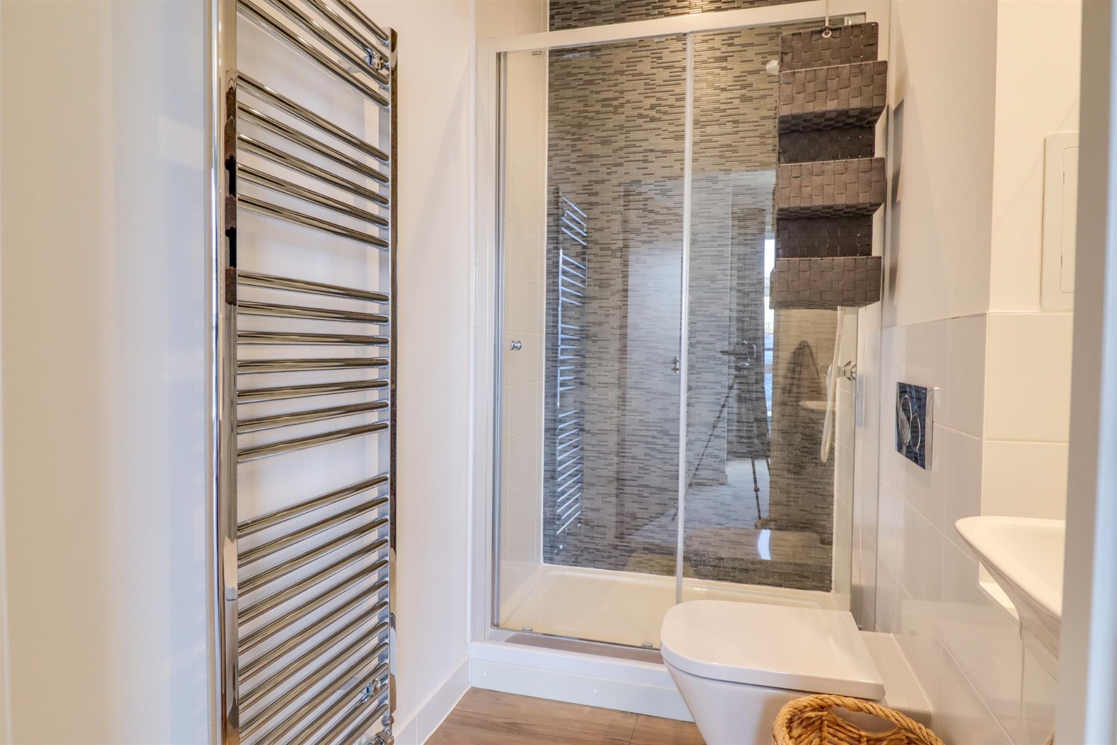 Smooth finish to ceiling with inset spotlights, shower cubicle with mains fed shower, wash hand basin and low level WC, heated ladder towel rail, tiling to applicable areas, laminated flooring.