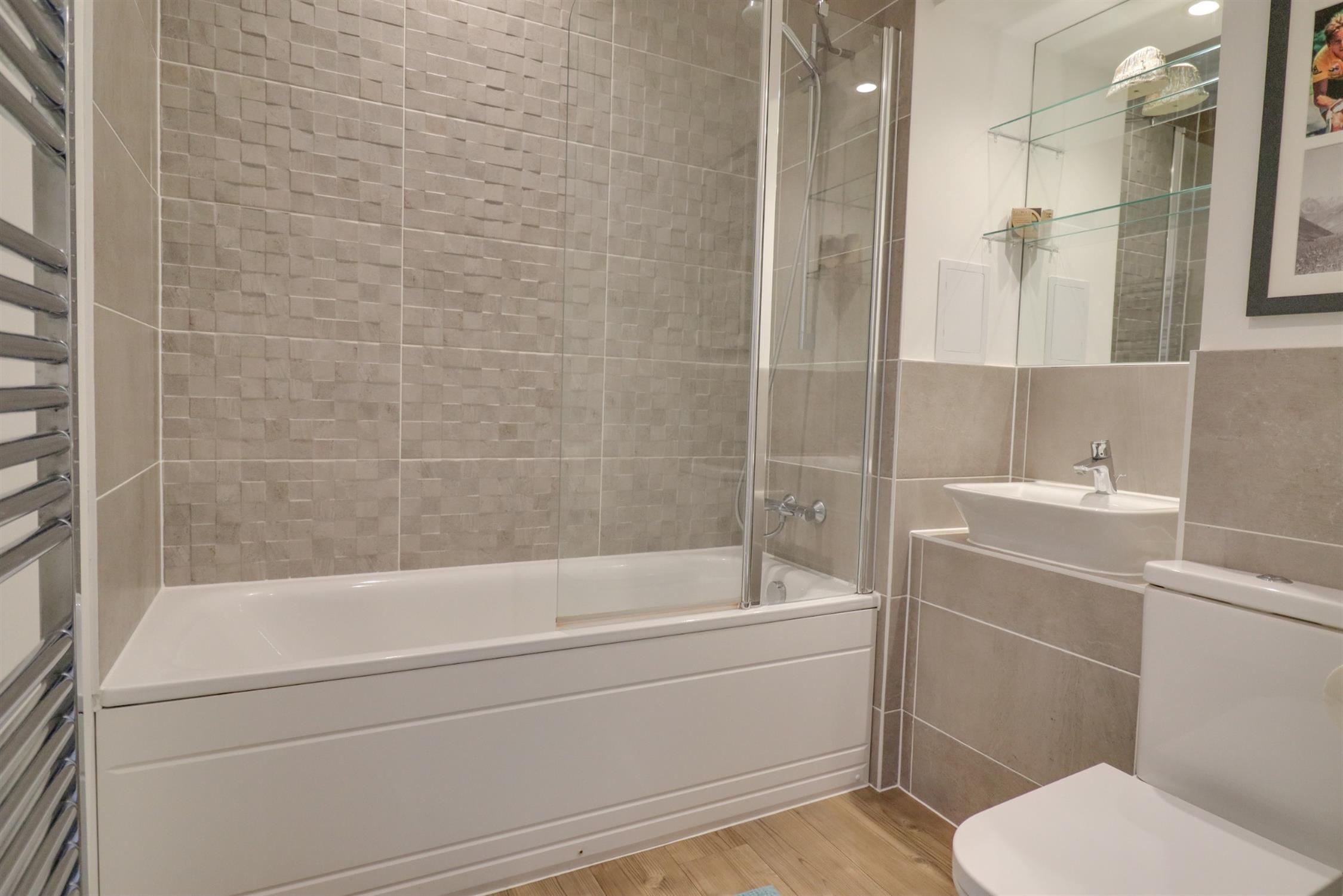 Smooth finish to ceiling with inset spotlights, contemporary three piece suite comprising panel enclosed bath with mains fed shower over, wash hand basin and low level WC, heated ladder towel rail, tiling to applicable areas, laminated flooring.