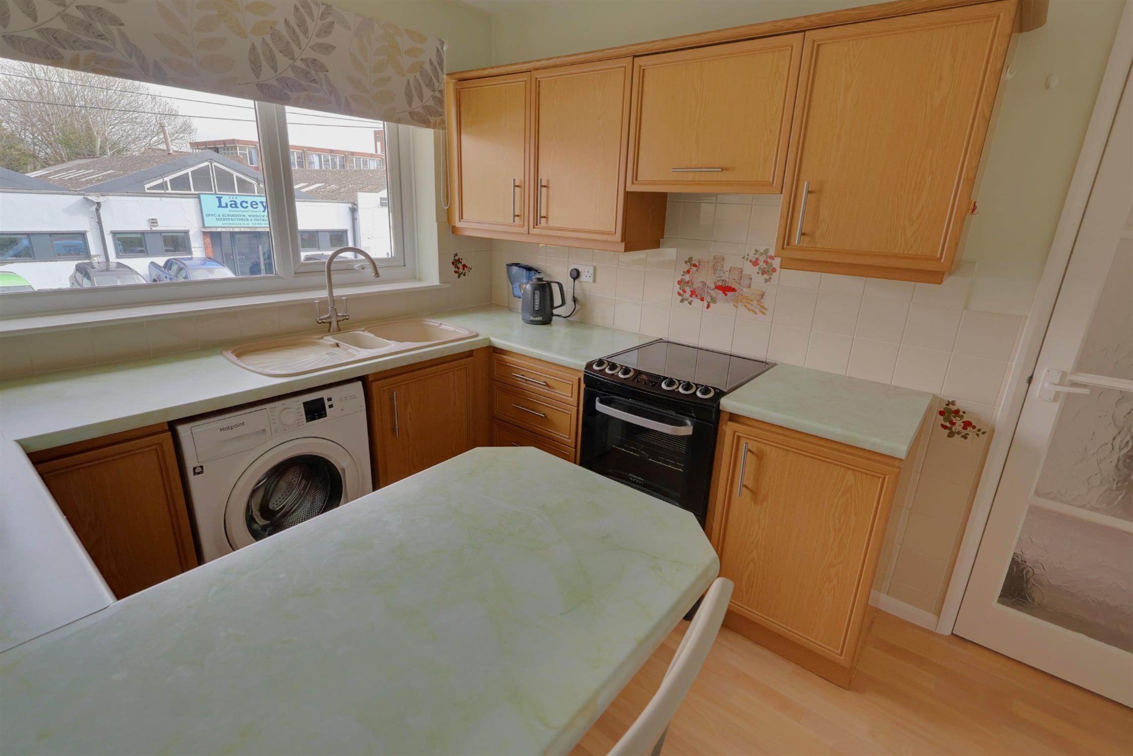 At the heart of the home is a generous lounge, offering ample space for both comfortable seating and a dining area—perfect for relaxing or entertaining. The kitchen is well-proportioned for a property of this type, featuring a range of cupboards and worktop space, a breakfast bar, and room for appliances.
