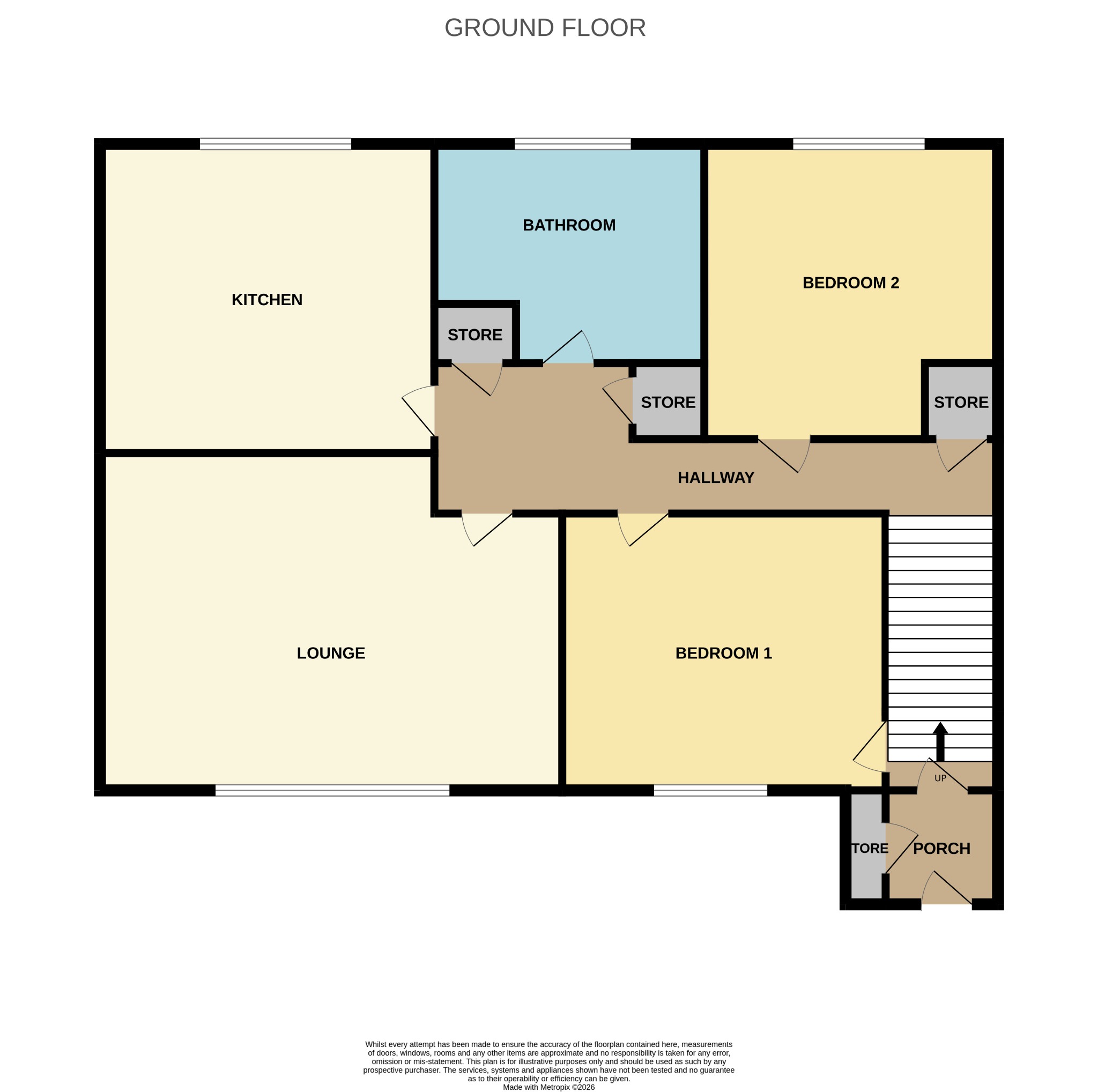 The property is accessed via a private entrance porch, which includes a useful storage cupboard and an additional internal door for enhanced security. Stairs lead up to the first-floor accommodation, where a welcoming hallway provides access to all rooms and benefits from two built-in storage cupboards.