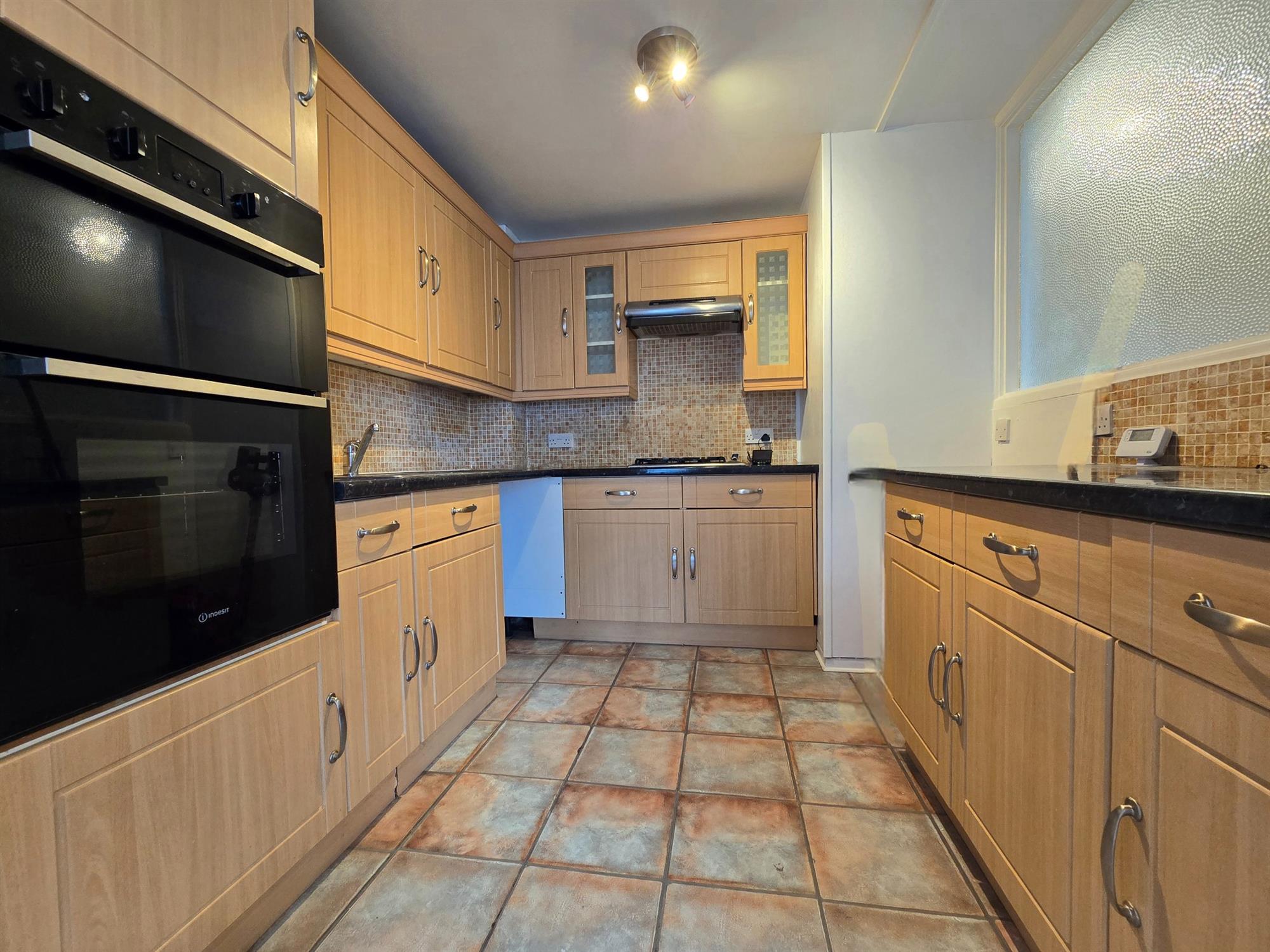 Smooth finish to ceiling, a range of matching wall and base mounted units with rolltop work surface over, inset one and a half sink and drainer, integrated oven and cooker with extractor fan over, tiled splashbacks, space for fridge/freezer & washer/dryer.
