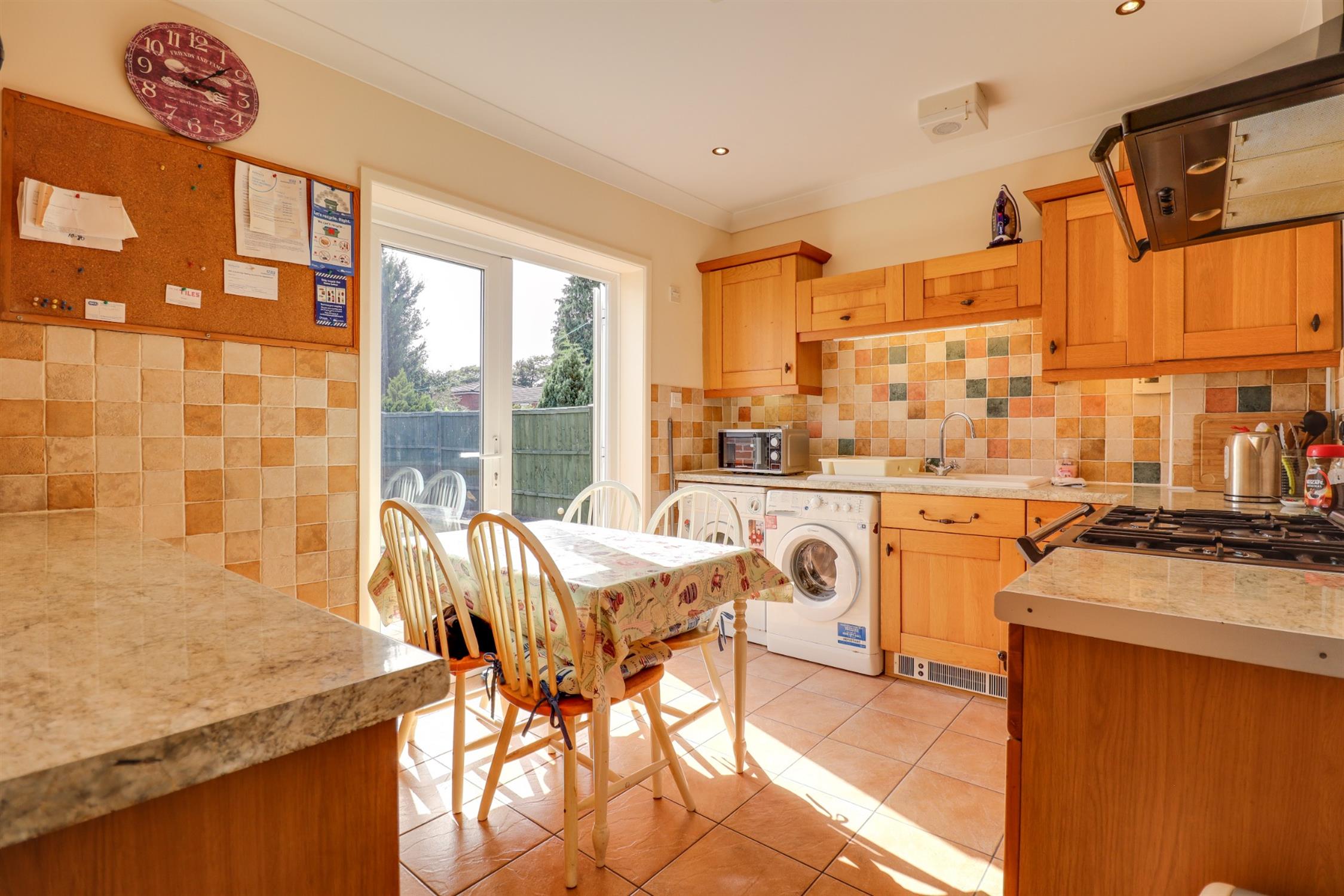 Smooth finish to coved ceiling with inset spotlights, UPVC double glazed French doors to rear elevation, range of matching wall, base and drawer units with work surface over, sink and drainer inset, gas range cooker, space for appliances, tiled splash backs.