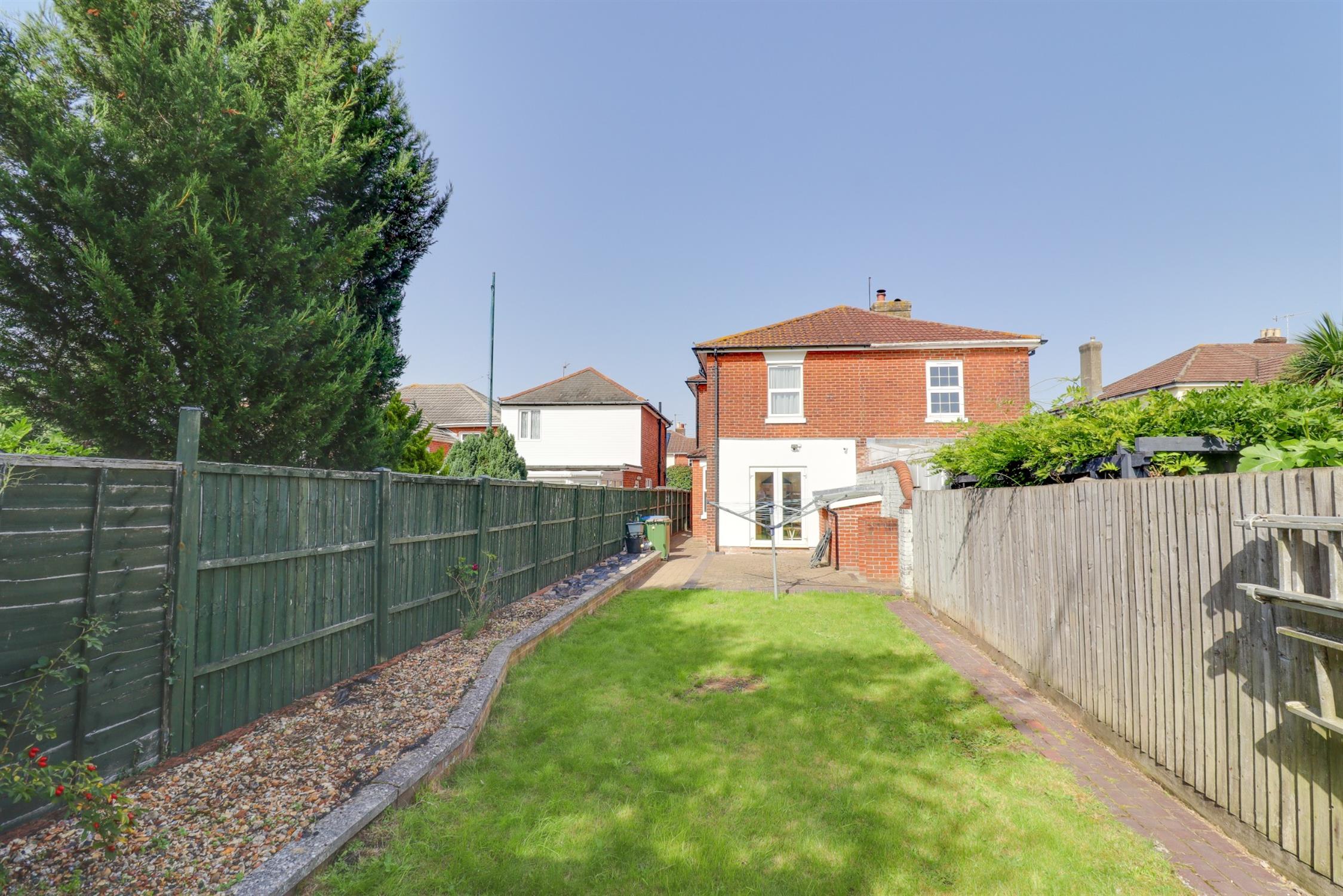 Panel enclosed fencing, mainly laid to lawn with shrub borders, patio seating area, pathway to rear & side access. Brick built shed & further hard standing base for a large shed to rear.