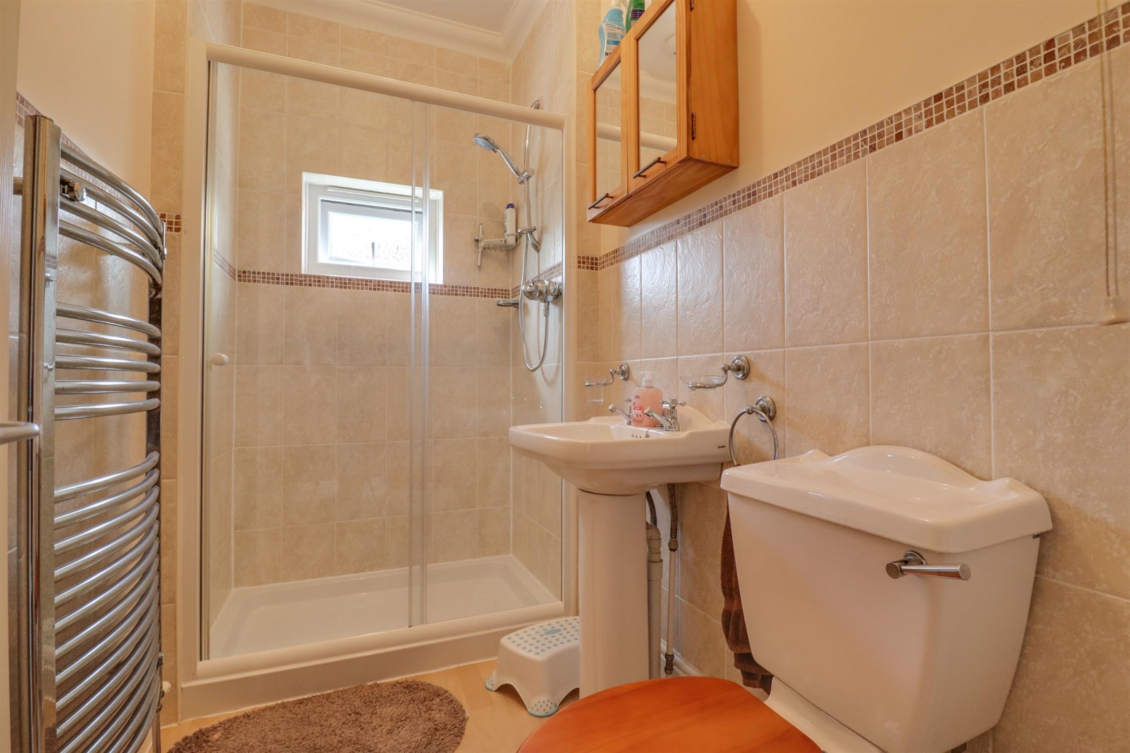 Smooth finish to ceiling, UPVC double glazed window to side elevation, walk in shower cubicle with mains fed shower over, wash hand basin, low level WC, heated towel rail, tiling to applicable areas.