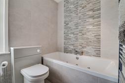 BathroomSmooth finish to ceiling with inset spotlights, double glazed window to side elevation, tile enclosed jacuzzi bath with centralised taps, low level WC, vanity wash hand basin, heated ladder towel rail, fully tiled.