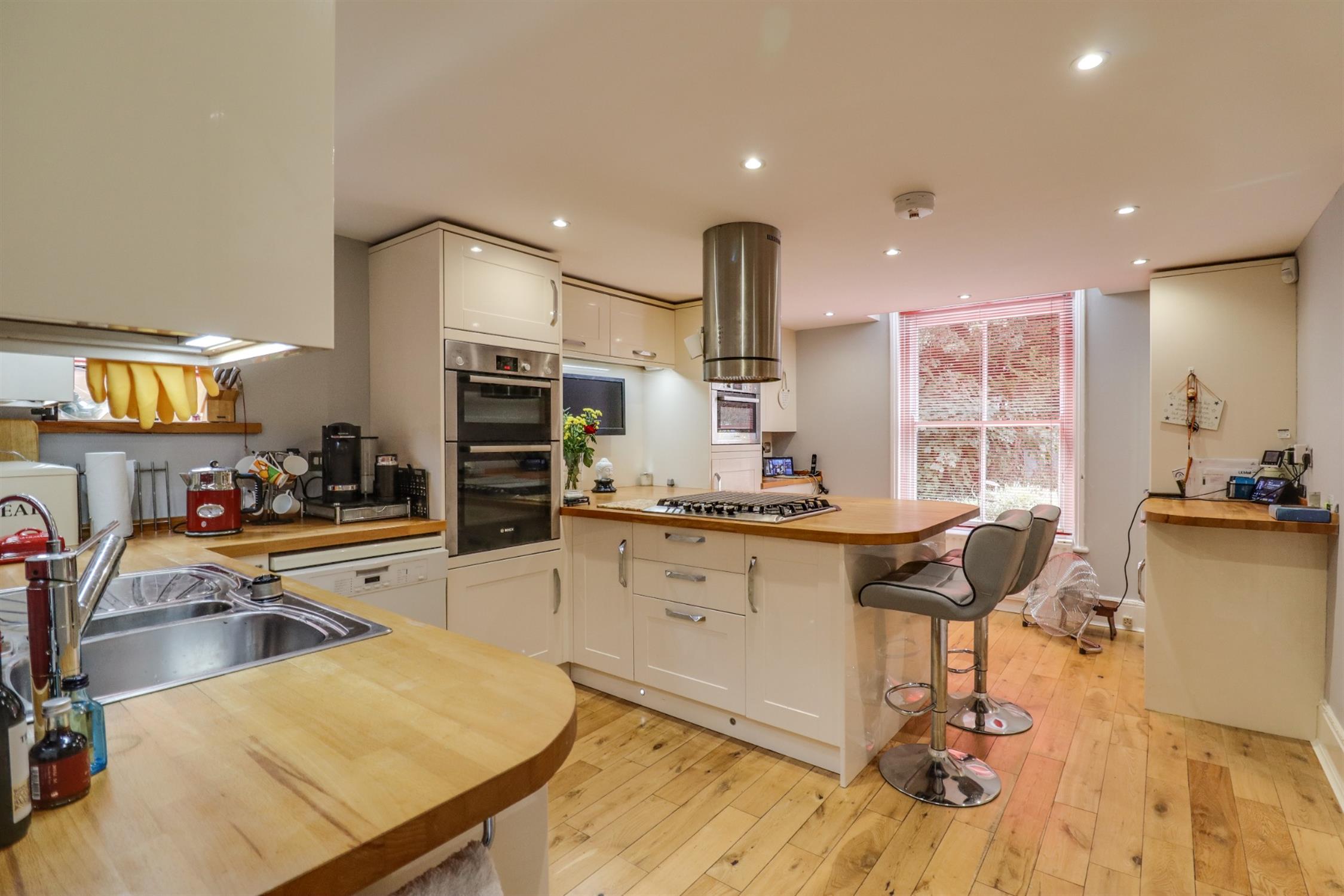 Smooth finish to ceiling with inset spotlights, original sash window to front elevation, double glazed window to side elevation, range of modern wall base and drawer units with work surface over, stainless steel sink and drainer inset, integrated double oven, microwave and gas hob with extractor fan over, space for dishwasher, breakfast bar, plinth lighting, opening to: