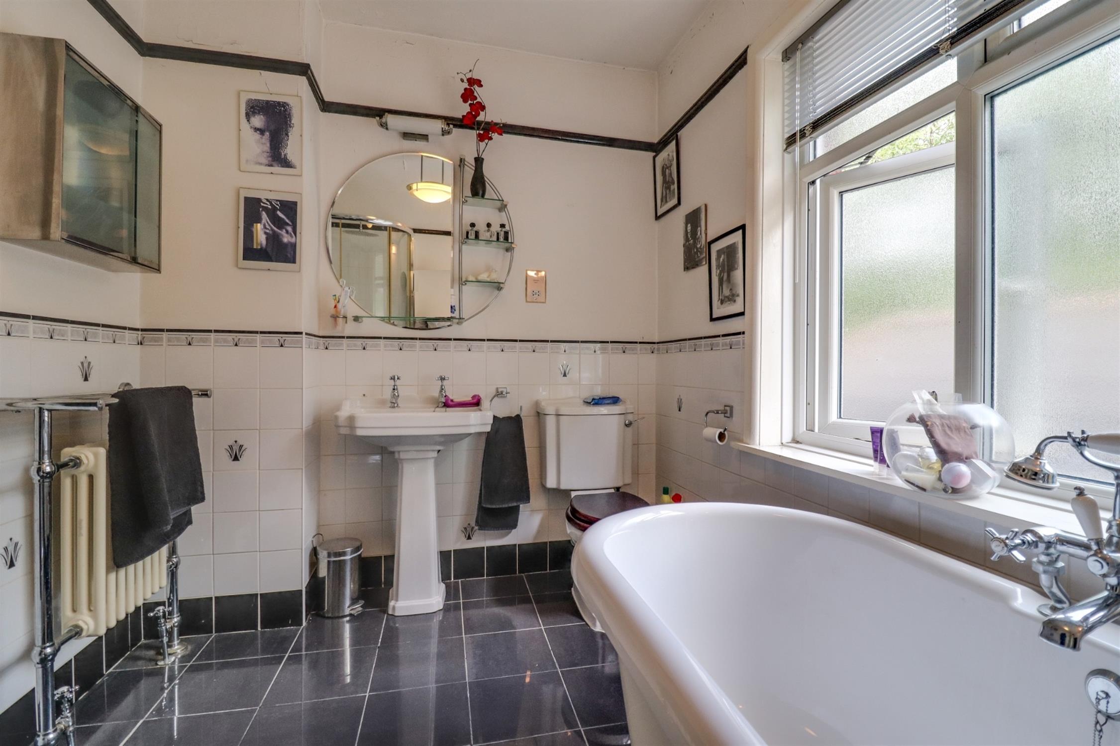 Textured finish to ceiling, double glazed window to rear elevation, picture rails, four piece suite comprising roll top claw foot bath with centralised taps, corner shower cubicle, wash hand basin and low level WC, radiator, tiling to applicable areas and flooring.