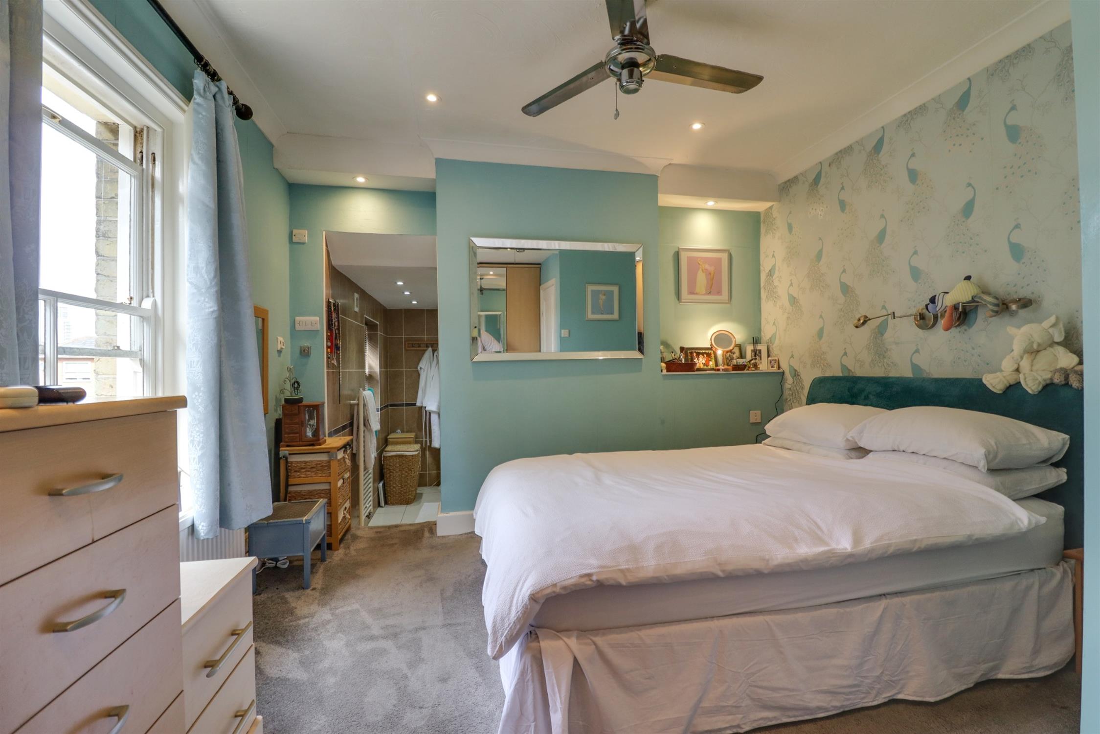 Smooth finish to coved ceiling with inset spotlights, original sash window to front elevation, radiator.