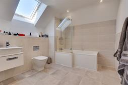 BathroomSmooth finish to ceiling with Velux window, inset spotlights, panel enclosed 'P'-shaped bath with mains fed shower over, wash hand basin with storage, low level WC, heated towel rail, tiling to principle areas and flooring.