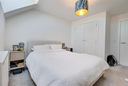Smooth finish to ceiling with Velux windows, inset spotlights, built in wardrobe, radiator.