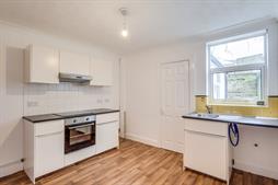 Textured finish to coved ceiling, double glazed window to rear elevation, a range of matching wall, base and draw units with roll top work surface over, inset sink and drainer, built in cooker with hob and extractor fan over, tiled splashbacks, space for white goods, understairs cupboard.