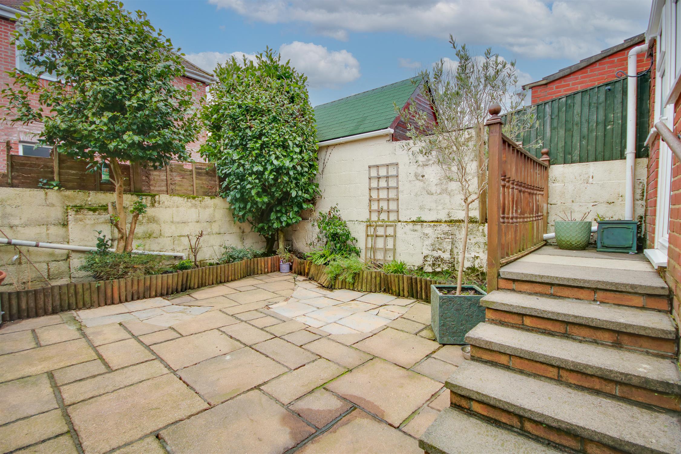 Enclosed westerly rear garden designed with low maintenance in mind, patio seating area with flower and shrub borders, side access.