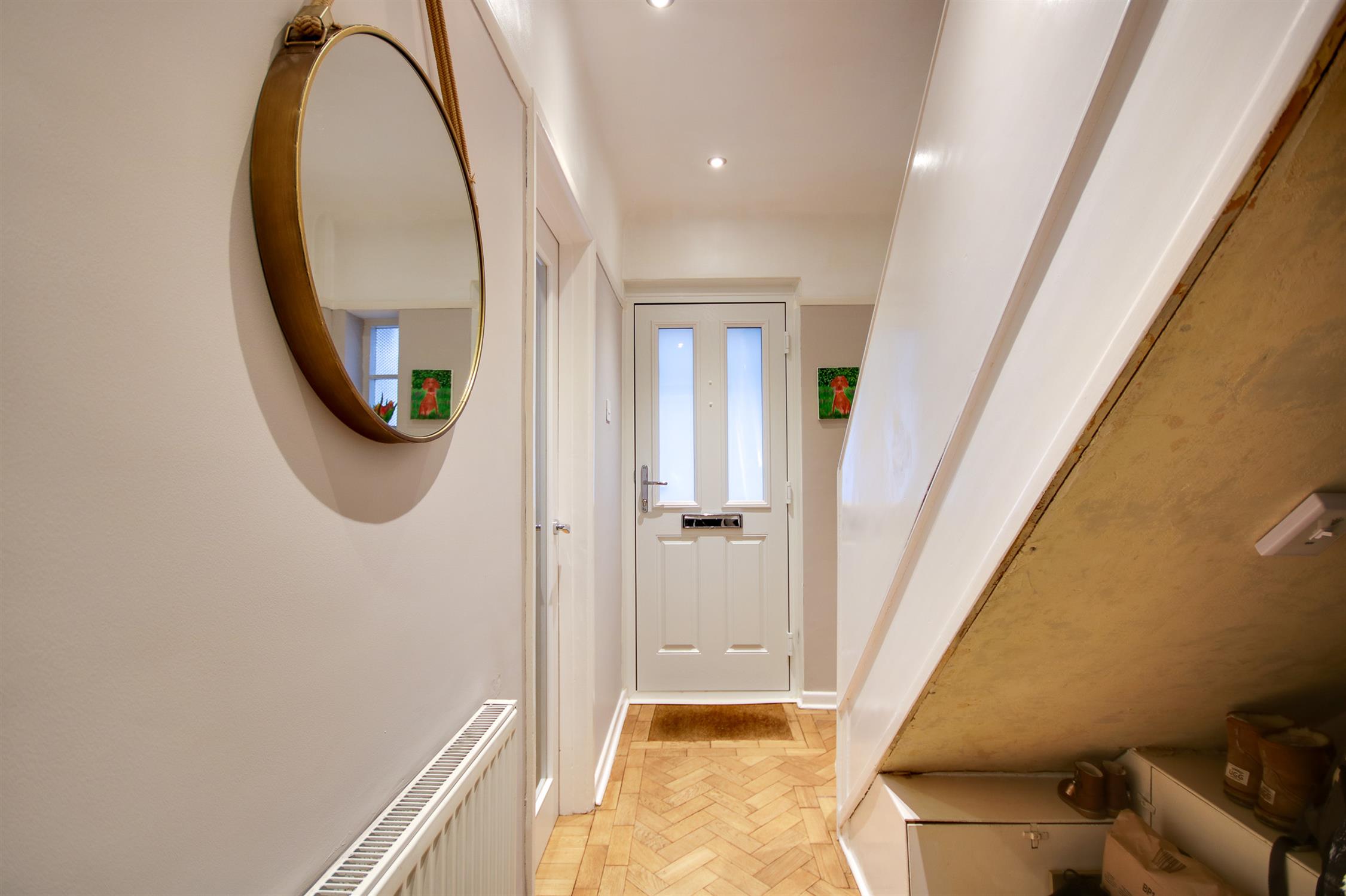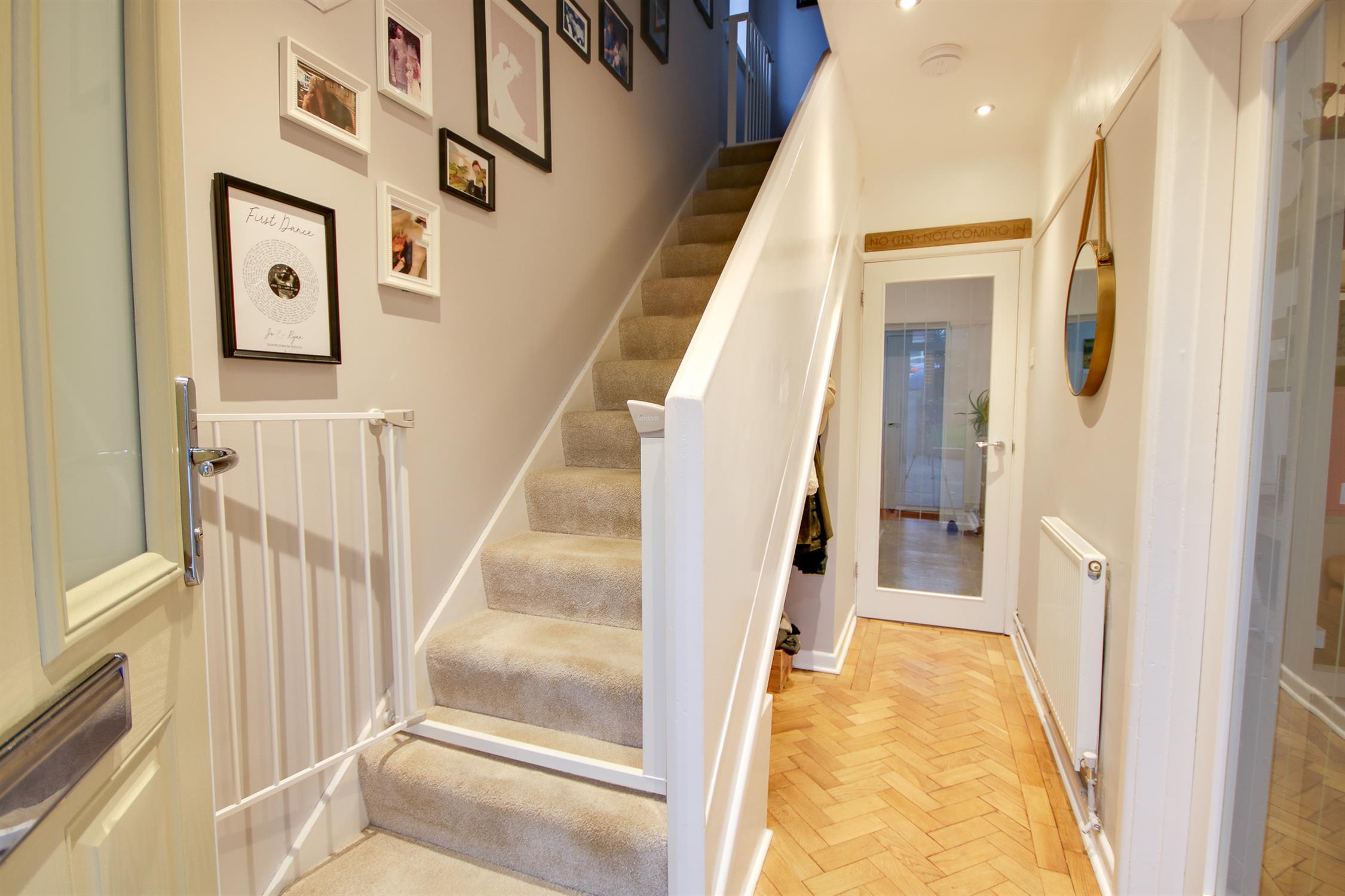 Smooth ceiling with inset spotlights, picture rail, window to front, radiator, stairs rising to first floor, stained and varnished original parque flooring.
