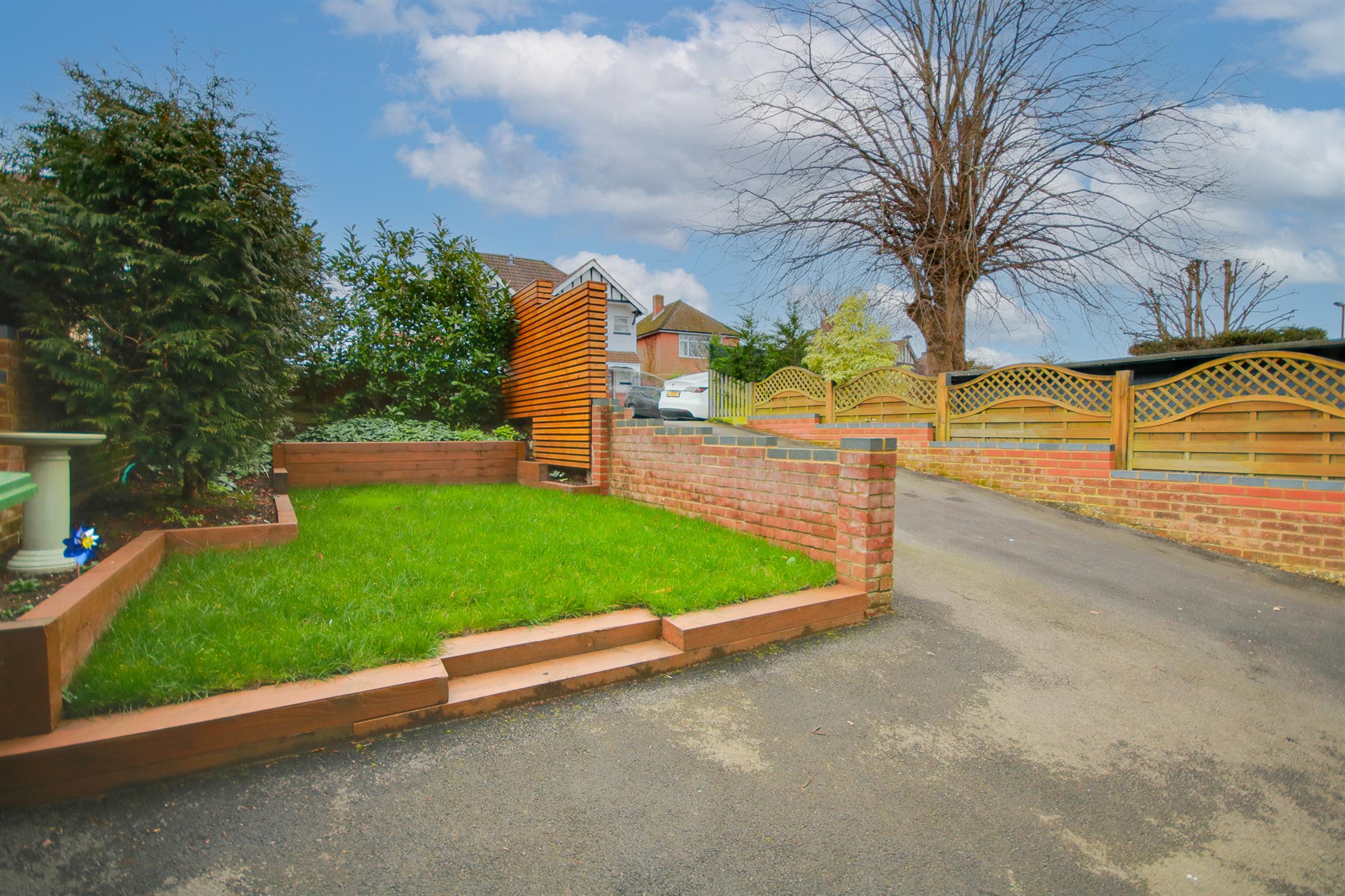 Driveway providing off road parking for multiple cars, an acoustic panelled feature wall, EV charging point, neat lawn.