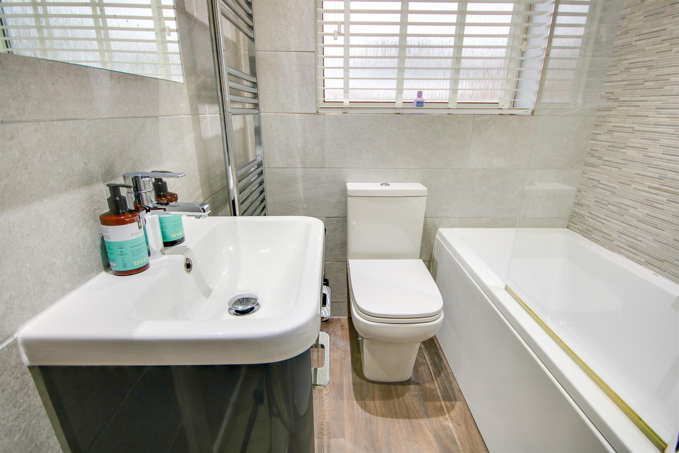 Smooth ceiling with inset spotlights, three piece suite comprising: WC, wash hand basin and panel enclosed bath with rainfall style shower over, full height heated ladder towel rail, fully tiled walls.