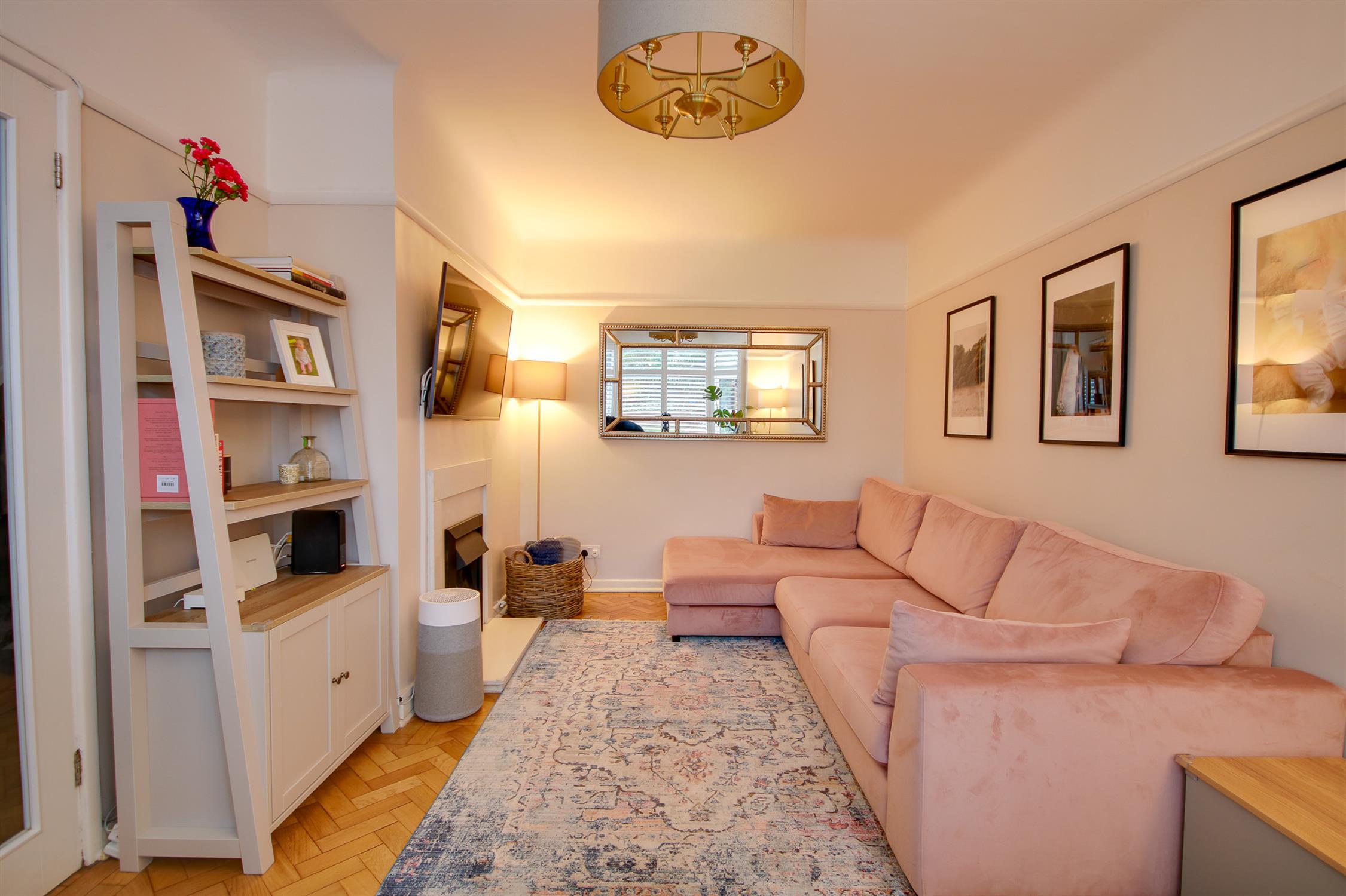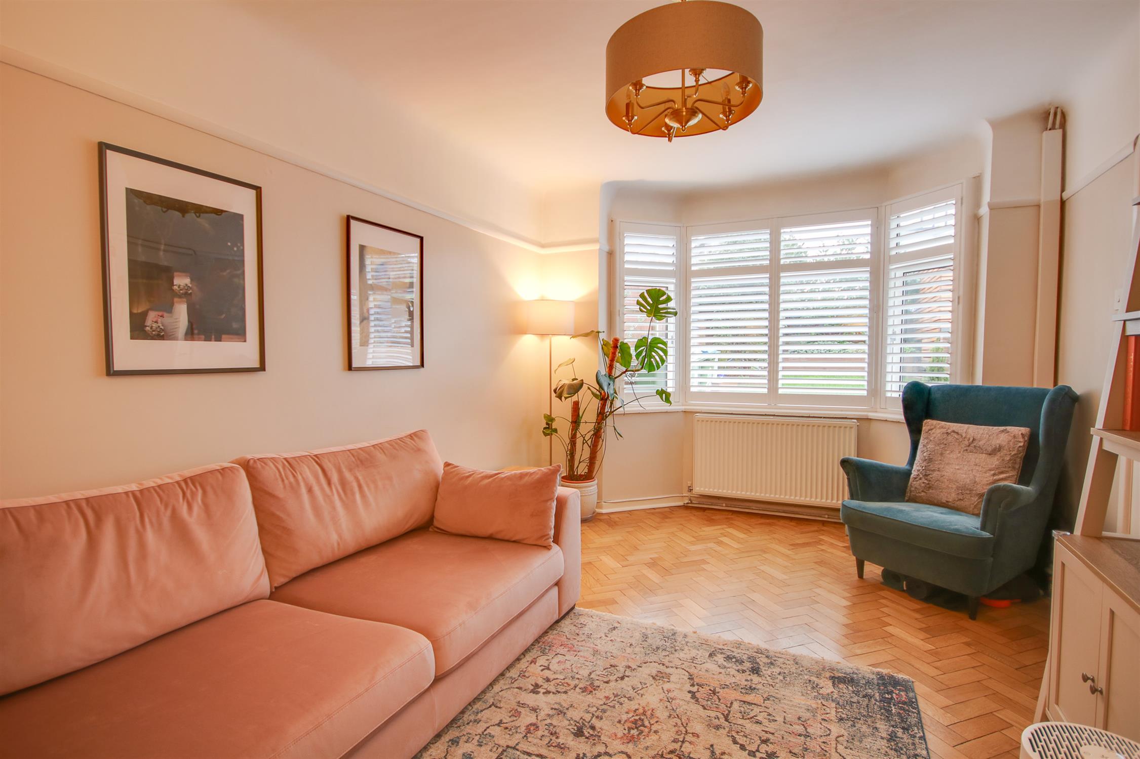 Smooth ceiling, picture rail, UPVC double glazed bay window to front with hardwood fitted shutters, electric fire and surround, radiator, original stained and varnished parque flooring.