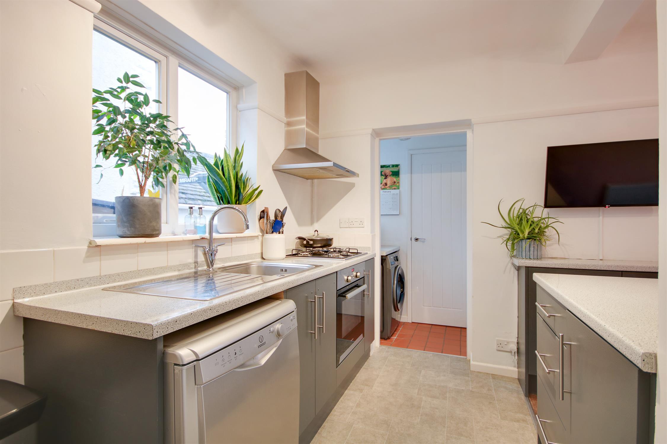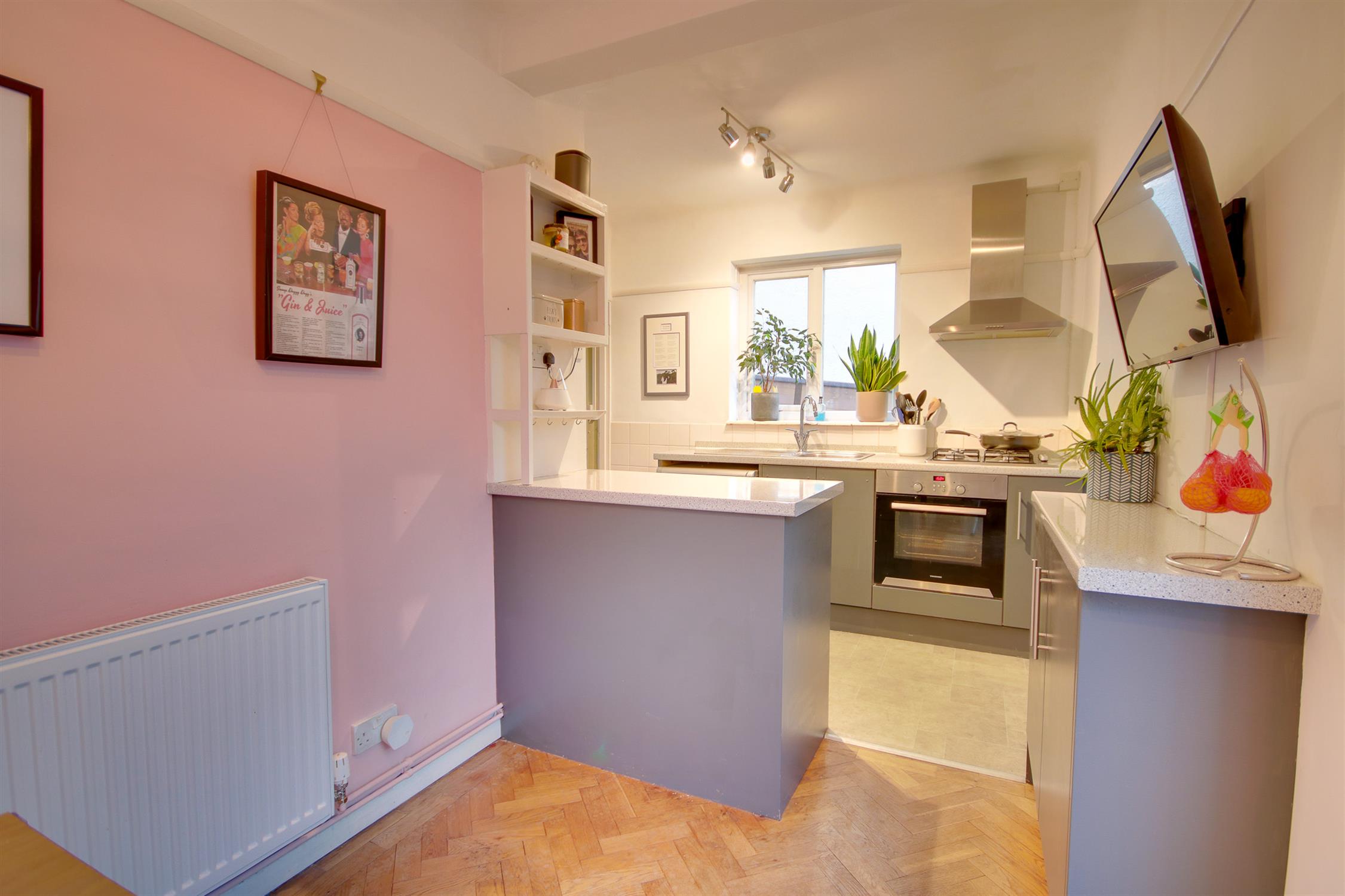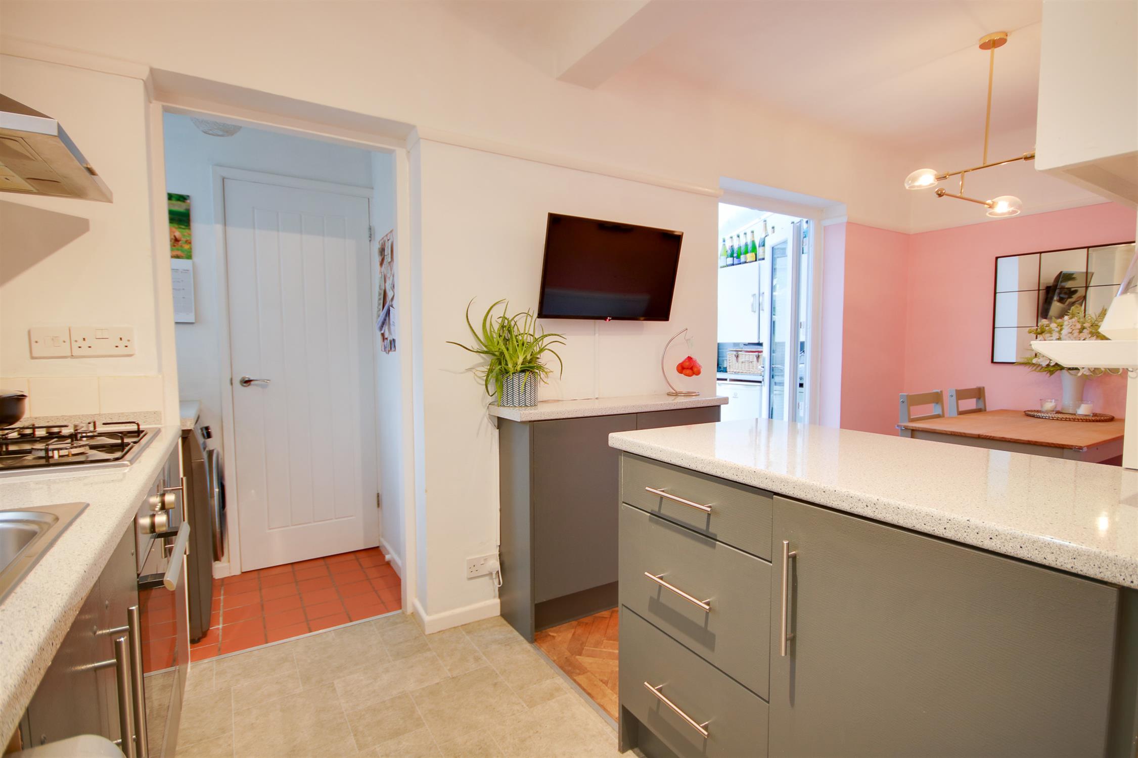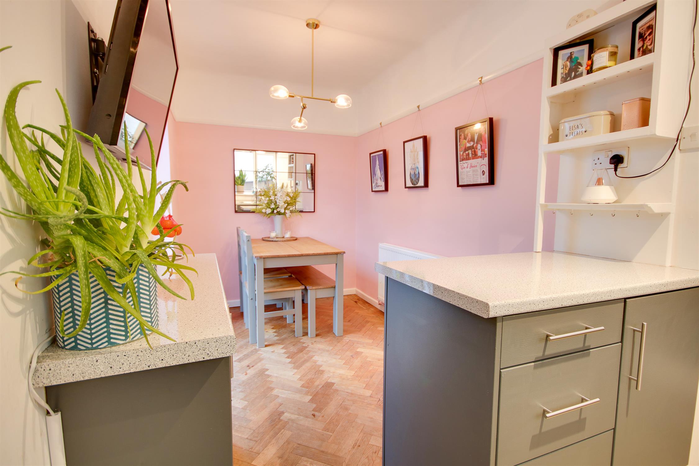 Smooth ceiling with picture rail, UPVC double glazed window to side, UPVC double glazed French doors to rear, base and drawer units with work surface over with stainless steel sink with drainer inset, built in oven with gas hob with stainless steel extractor fan over, parque flooring to dining area, radiator, space for fridge/freezer, dishwasher and built in storage.